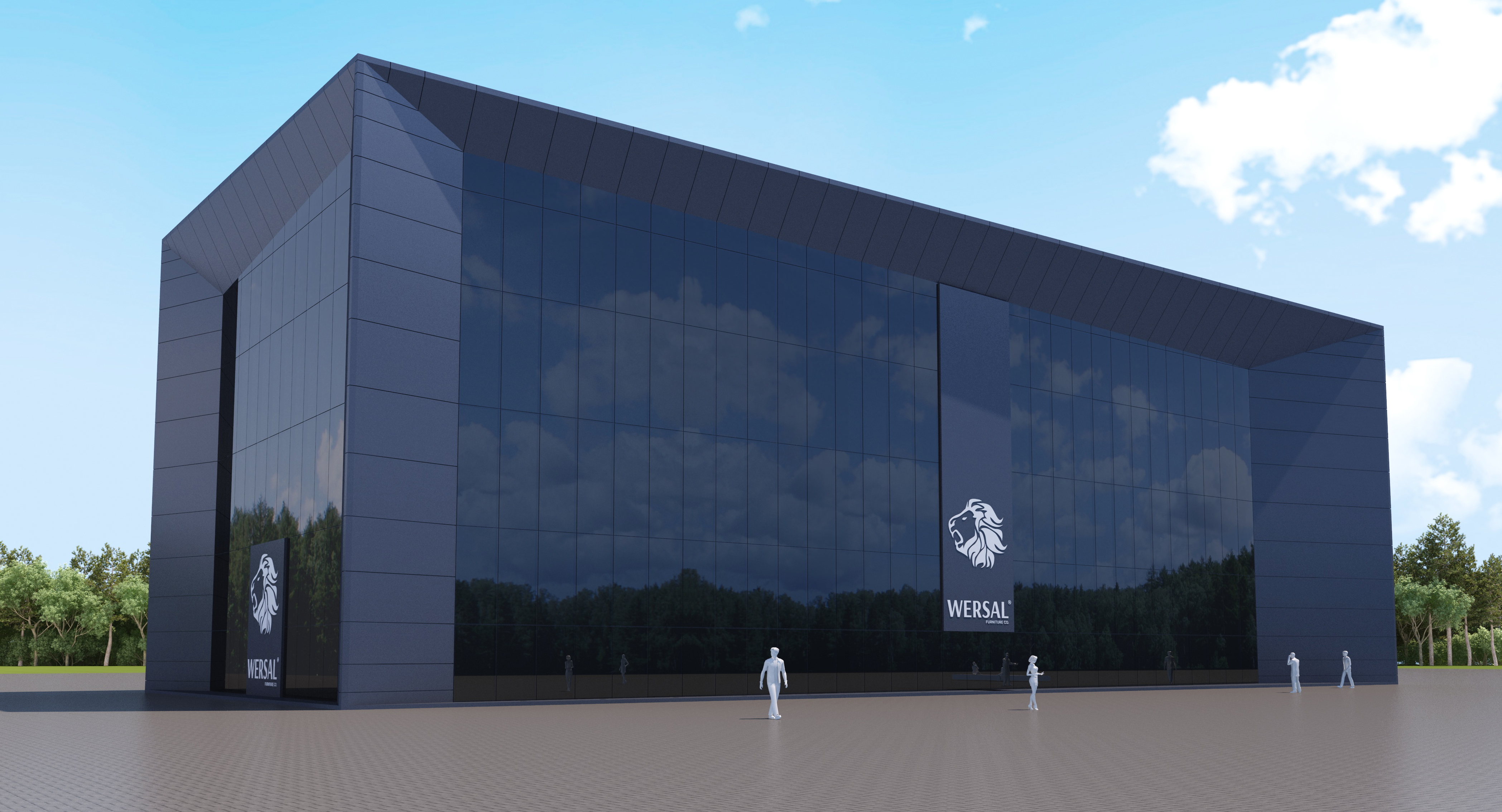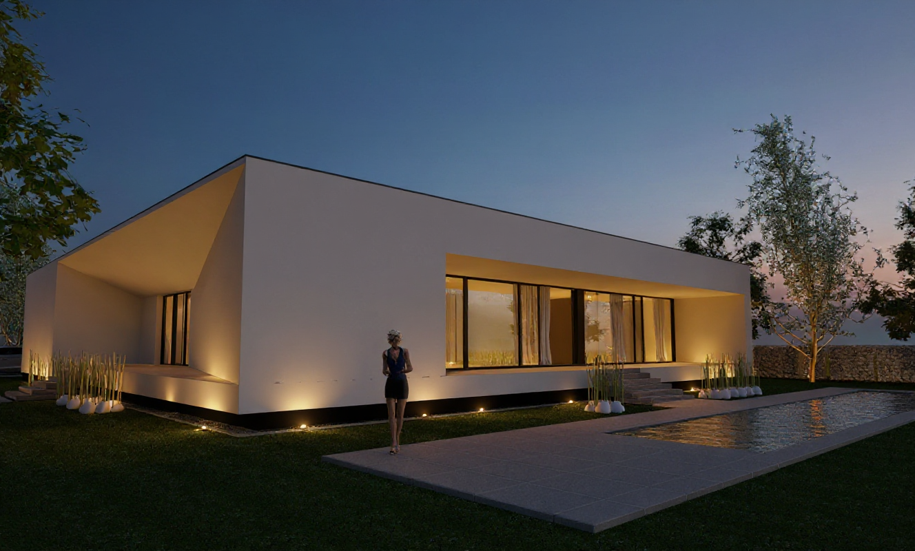 this is an exterior fa ade render do not change or modify any object dimensions keep the building model proportions material improve the lighting realism and render quality enhance global illumination soft shadows reflections on glass surfaces material clarity and overall depth improve the sharpness atmospheric realism and natural daylight balance without altering any colors or materials do not reinterpret or redesign the fa ade only make the final image more realistic brighter clearer and visually high quality while keeping everything else unchanged make the exterior fa ade render more realistic by turning on all existing lights use the same model materials and colors without any changes make every light fixture and led strip emit warm white light 2700 3000k with realistic glow reflections and global illumination on nearby surfaces keep the same camera angle and do not modify any architectural elements only improve the lighting and realism add more trees and bushes pines trees add more trees