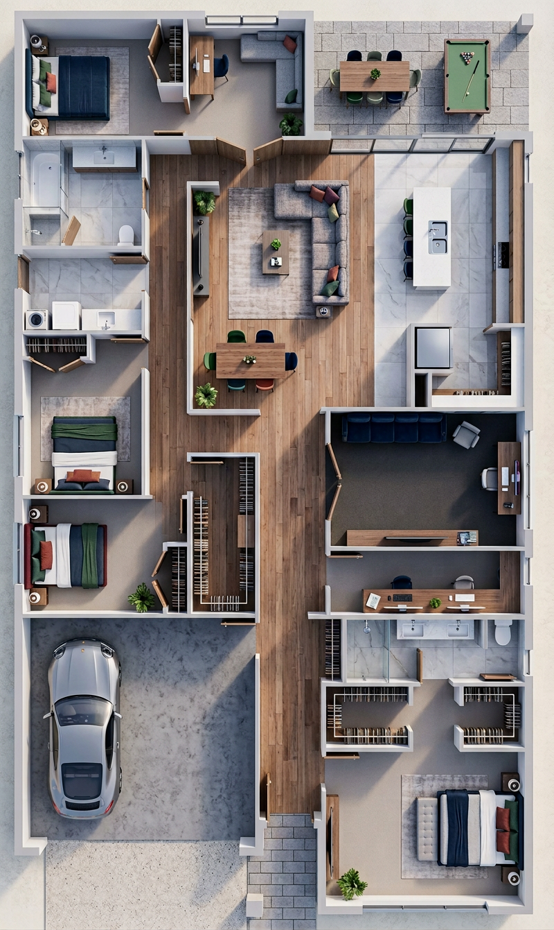 photorealistic image of a bright coastal style bathroom interior full height backsplash walls inside shower vertically oriented rectangular ceramic tiles approximately 4x12 proportion laid in a perfect grid with crisp white grout lines tiles rendered in light to medium gray green with subtle texture shading to show the vertical orientation and slight sheen brass shower fixture with a clear shower glass door large terrazzo tile flooring solid wood cabinetry in medium dark wood tone with visible straight grain and matte finish thick white marble or quartz slab with very subtle veining polished surface right white with soft gray shadows underneath the overhang