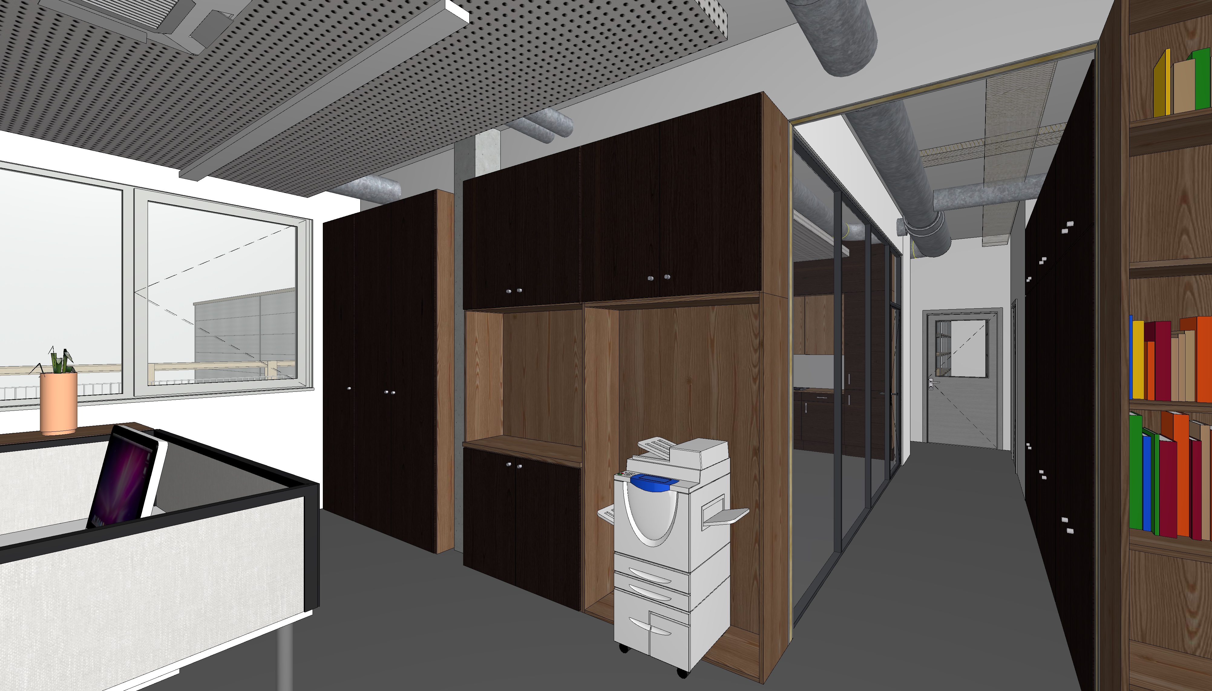 enhance this image to make it highly photorealistic but keep exactly the same color palette as the original image replace all surfaces with realistic materials and textures floor matte dark gray epoxy resin printer realistic plastic and metal materials with natural lighting books realistic paper textures and detailed spines use soft realistic lighting natural shadows and subtle reflections based on each material keep the original composition and colors only improve realism and materials