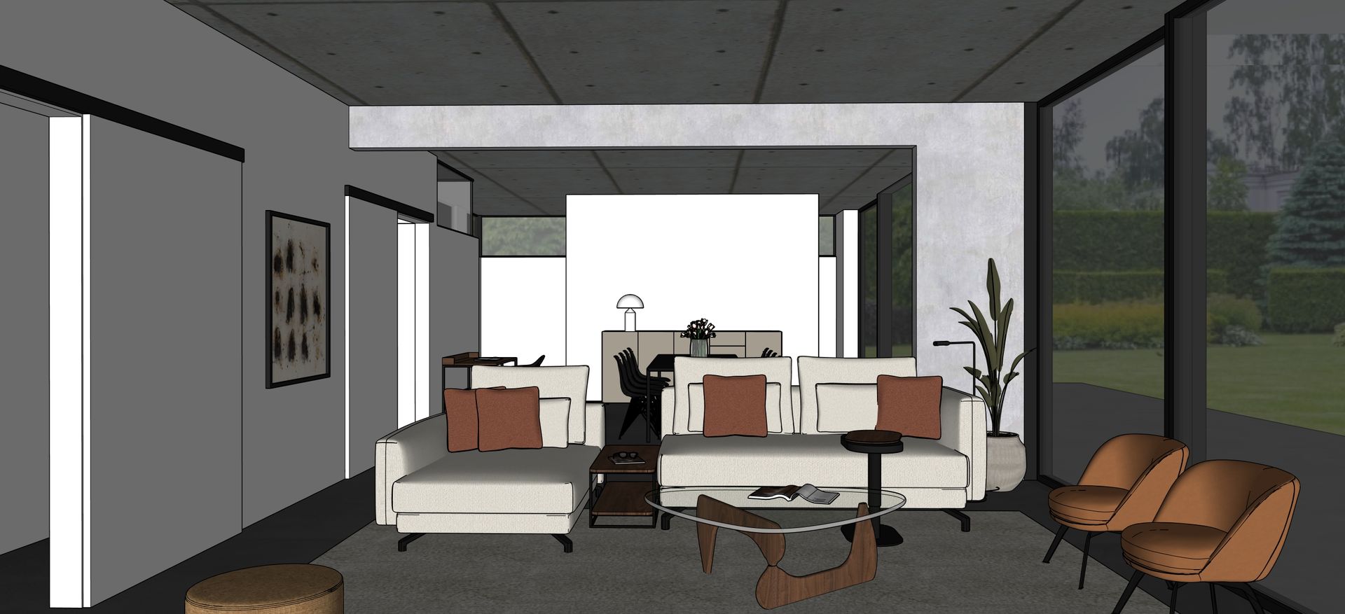 interior shot make the visualisation more realistic keep the objects furniture in the same shape and all the windows and everything like it is the lamp on the cupboard behind the sofa is the oluce attolo lamp