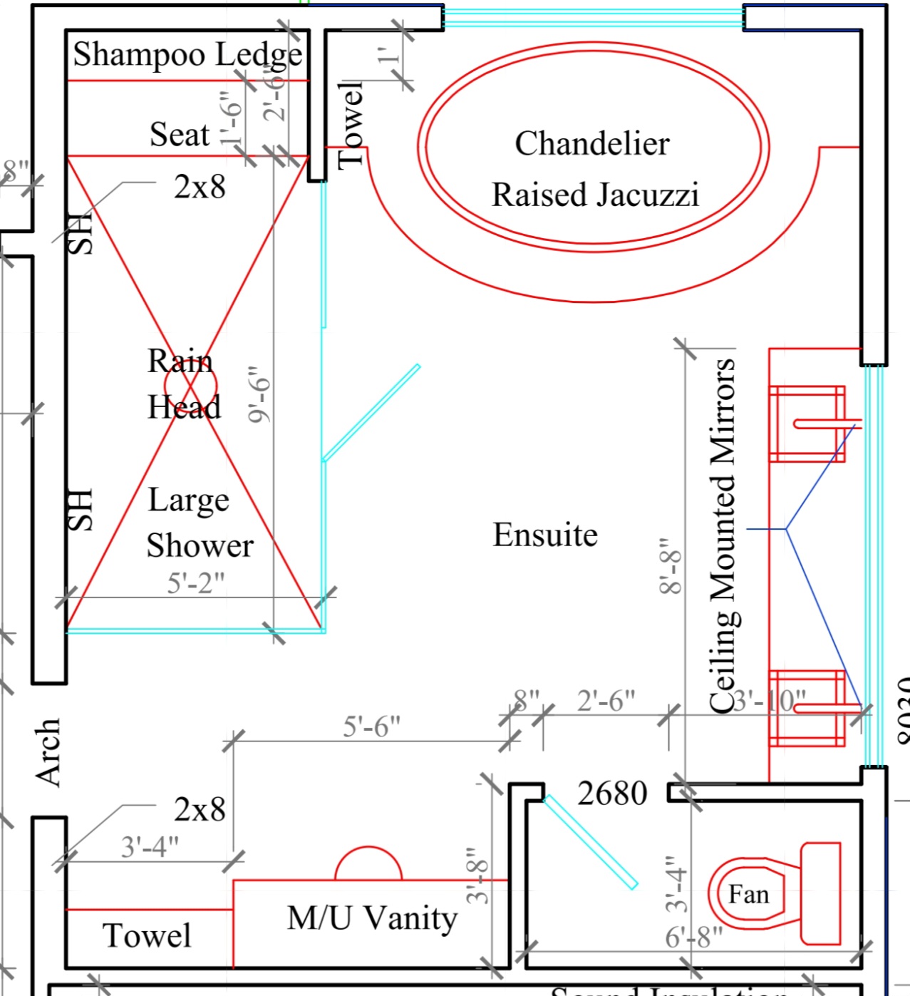 modern luxurious ensuite bathroom design spacious layout with a large rain shower in one corner surrounded by frosted glass the shower area has a sleek chrome showerhead with a waterfall effect adjacent is a raised jacuzzi tub illuminated with soft ambient lights from a sparkling crystal chandelier above use warm white and soft gold tones for the jacuzzi and chandelier creating a cozy yet elegant atmosphere the ceiling mounted mirrors reflect light enhancing the room s spaciousness a minimalist vanity area features a sleek marble countertop with subtle veins of silver and gray the overall ambiance is serene and sophisticated with calming light blue and aqua accents throughout complementing the clean lines and modern aesthetic architecture