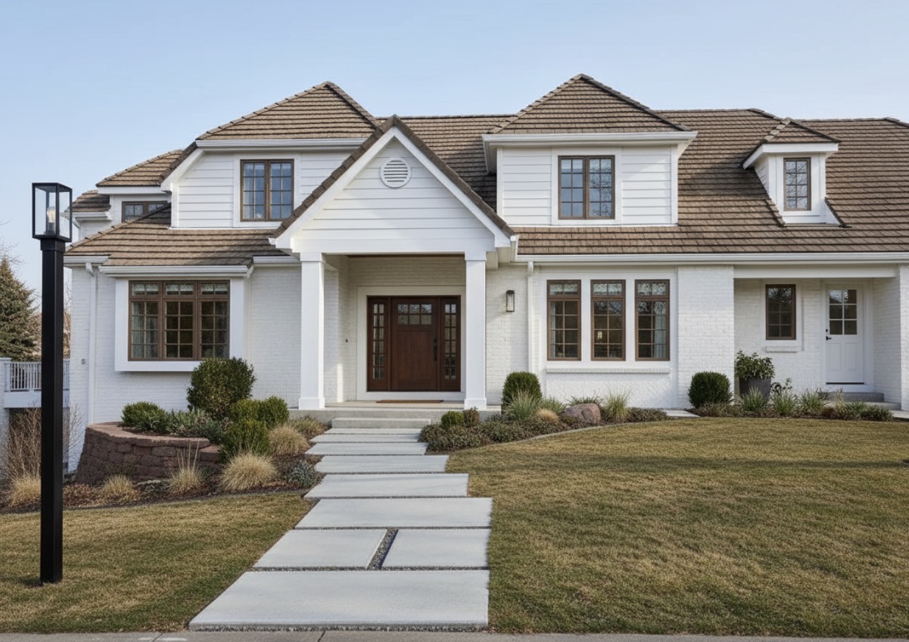 zaha hadid exterior shot make this exterior look like a studio mcgee exterior without changing the roof or the the siding keep the brick the same color architecture
