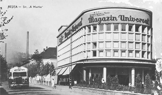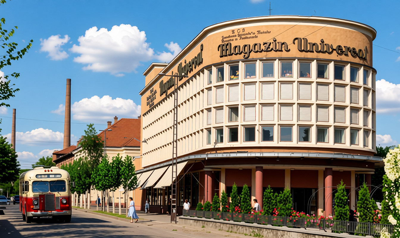 sunny day beautyful clouds 1950 s atmosphere cinematic view read the right letters on the building the front text is magazin universal