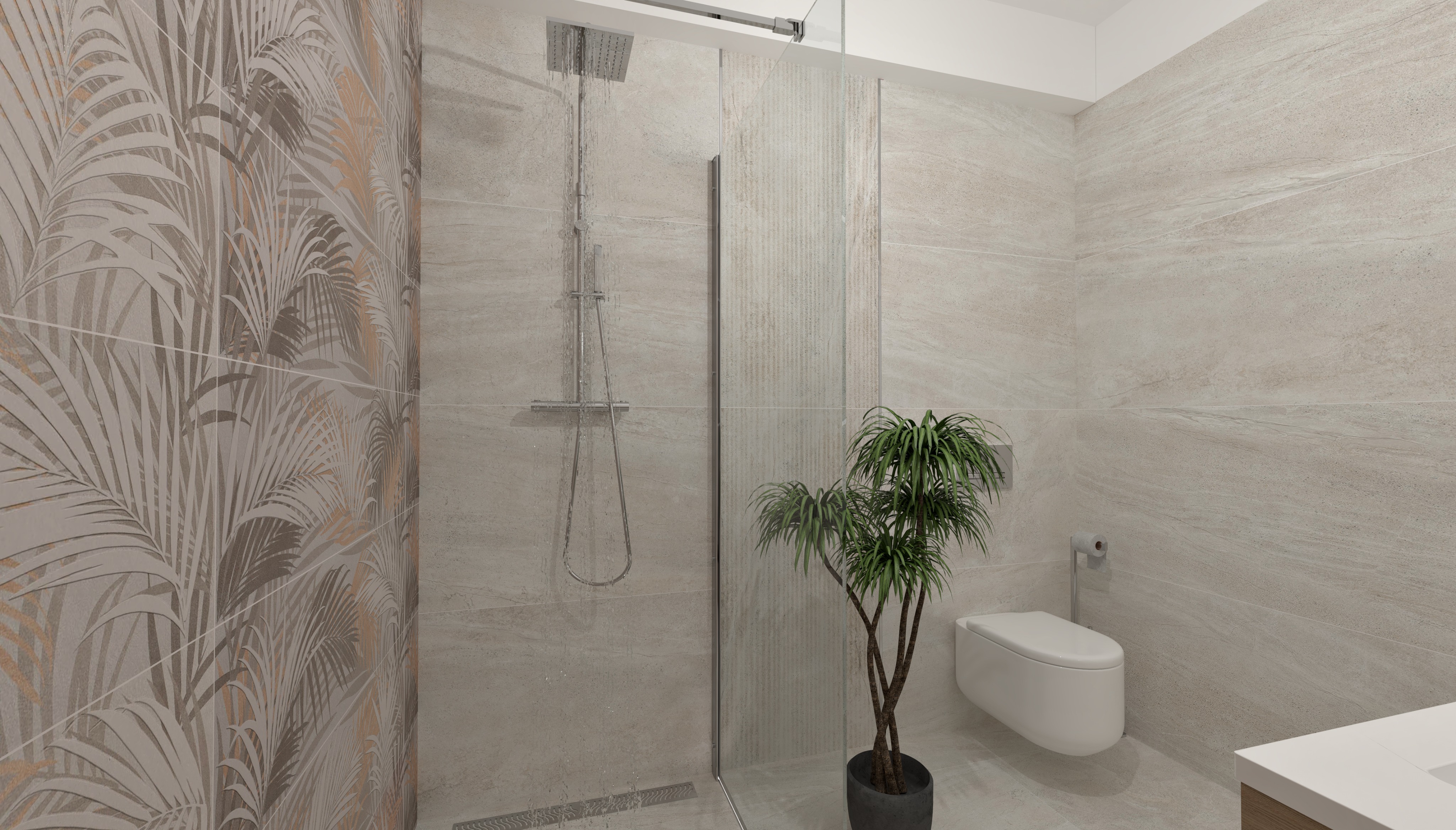 one spot light in the shower and one spot light on the toilet but not too intense neutral light