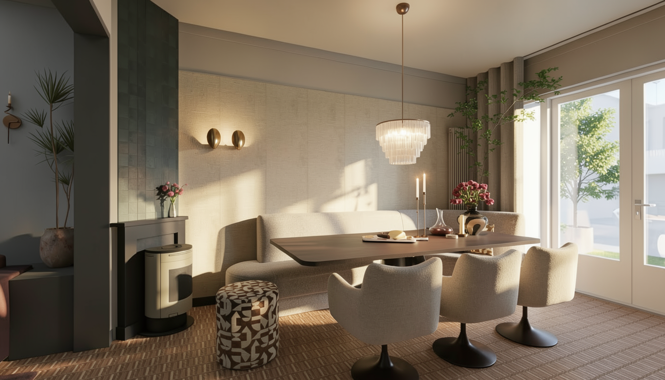 a modern restaurant terrace with a pergola for events modern design of chairs and tables that are set up for a elegant events elegand floral arrangements creating an atmosphere that is both sophisticated and romantic there are oval tables that are set for guests complete with gold candlesticks white plates silverware pink and cream colored tablecloths exquisite centerpieces and delicate accents like vintage crystal chandeliers hanging from above the chairs are decorated and have a textile covering the whole chair and a bow at the back that matches the white and beige collor pallete on the left there are glass walls with neutral tones luxury draped fabric hanging beige chandeliers from the beams with white crystal pieces light up the room with warm light and soft shadows from beams there are also smaller chandeliers hanging from the beams with beige fabric that light up the room with warm light and soft shadows from on the left side there are tables that are also decorated with table cloth in the same collor pallete that have food and beverages ready for the guests on the central area there is a big 3 story wedding cake from white chocolate and berries the middle smaller table is the dj booth with a laptop and some 2 speakers around large windows on left hand sides of room green plants behind glass walls the floor is natural dark hardwood the pergola pillars and beams are from aluminium collored light beige ral 1014 color code the pergola slats are also light beige ral 1014 color code pergola slats have led bands in the far end you can see a bar that is fiest rgb light bar from vondom and also a retrobar that is the vela rgb light retrobar from vondom the the terrain and the ground around is a lake area with greenery and grass specific for this kind of area the sky is blue with a few white clouds the sunlight is warm and casts soft shadows there are decorative elements all around and green plants to make it look more realistic format picture 16 9 extradetailed and ultrarealistic interior all elements have sharp details add realistic imperfections subtle fabric wrinkles slight surface reflections natural daylight with soft shadows realistic plants and trees around the terrace