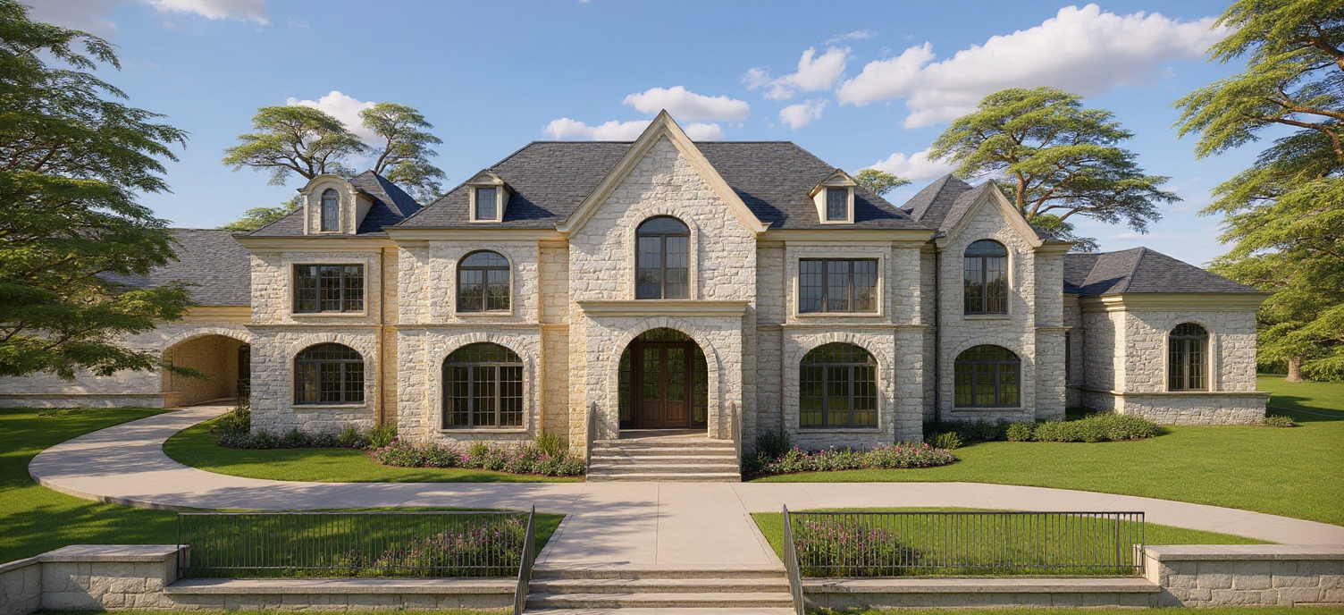 white stone walls dark slate roof charcoal gray steel windows charcoal gray roof trim smooth white limestone trim around windows smooth white limestone at entry vestibule and stairs arched front door and sidelights add lush landscaping bushes and flowers in front of house add trees native to tennessee behind house no railing at landscape wall in front of house