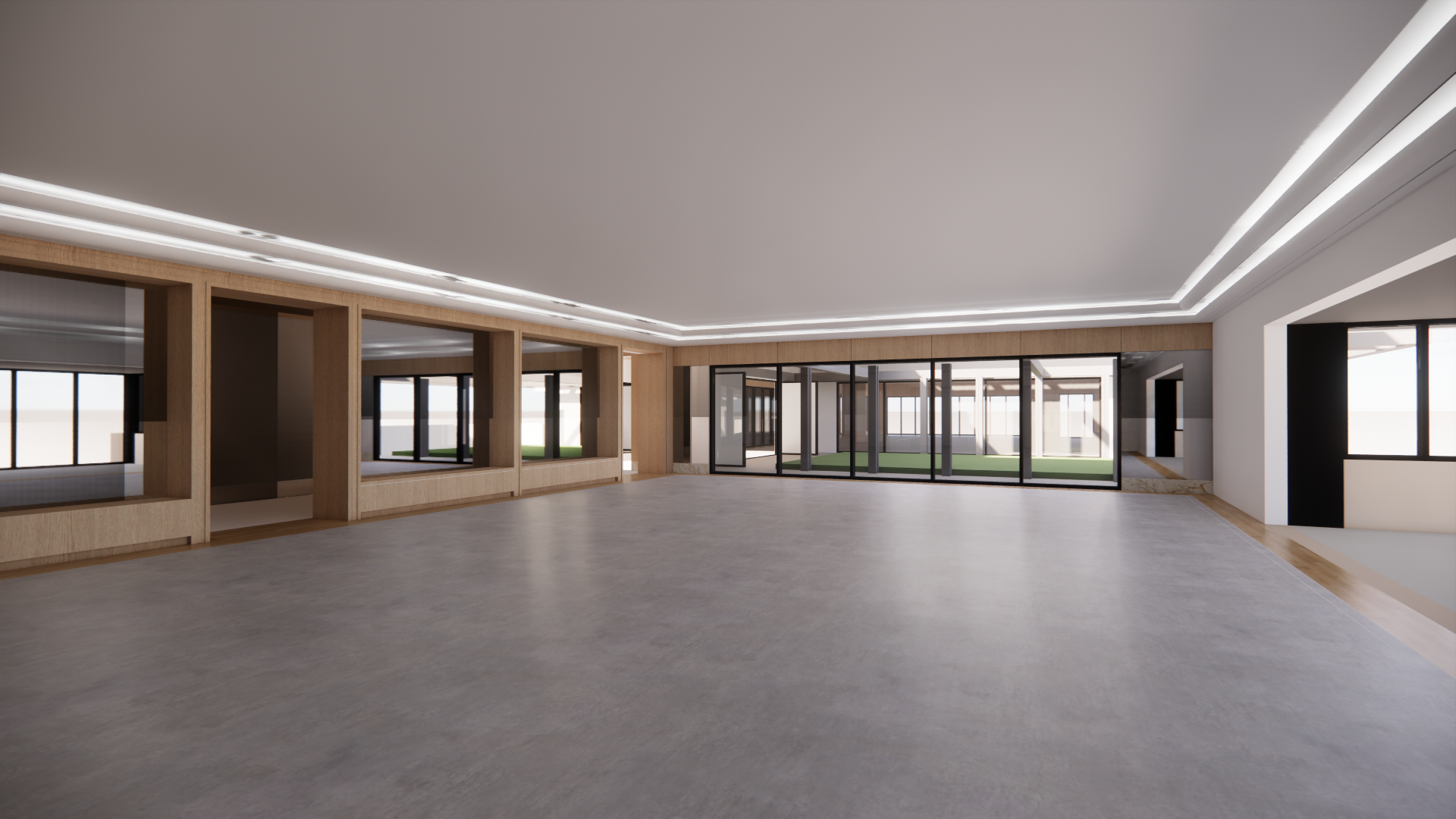 a spacious modern indoor fitness area with high ceilings and large windows the walls and ceiling are made of light oak wood creating a warm and inviting atmosphere the floor is a soft muted gray rubber adding elegance and sophistication the trim and window frames are a sleek black providing a striking contrast to the wood and glass elements the lighting is a combination of ambient warm white lights and focused spotlights casting a soft inviting glow throughout the space the atmosphere is serene and sophisticated perfect for a versatile event space add downlights to the ceiling