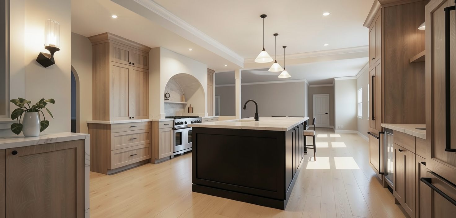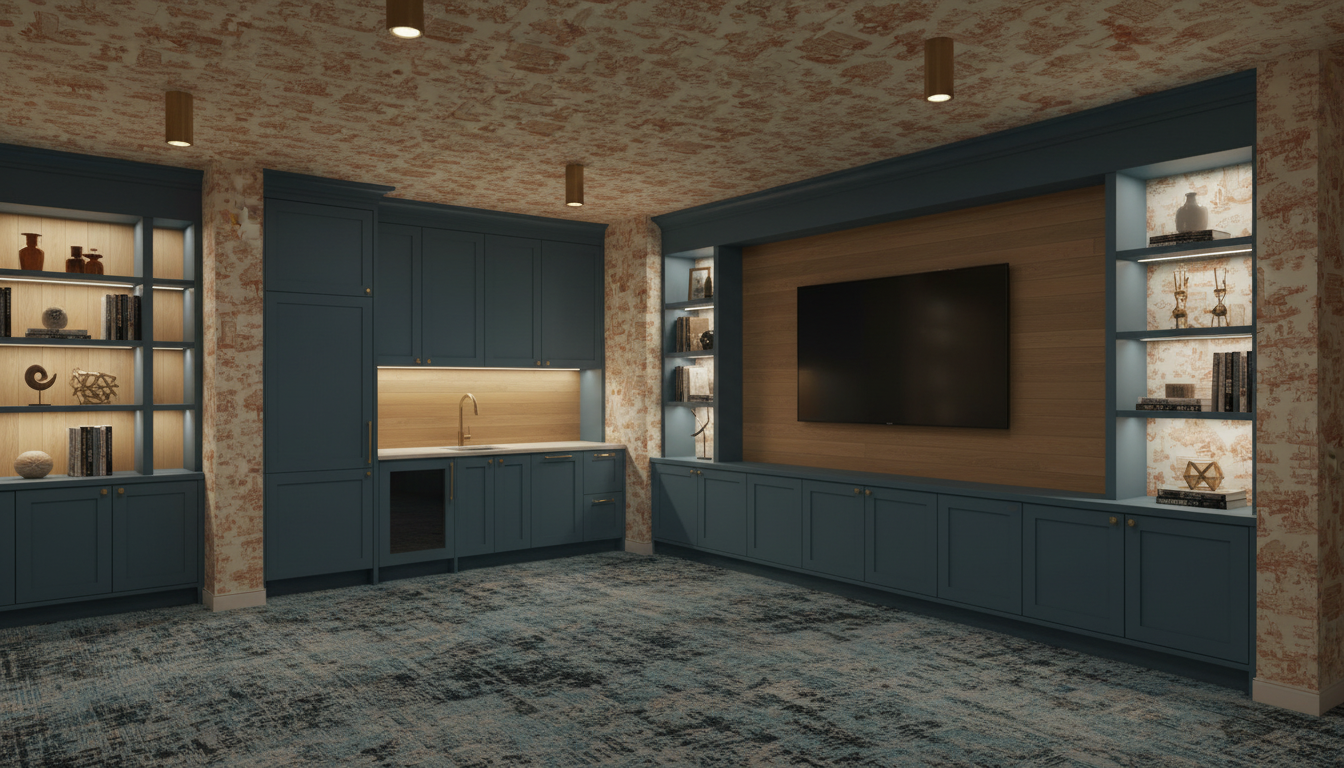 increase the overall brightness of the room while keeping the same materials and colors use more natural light coming from windows and increase warm interior lighting add recessed ceiling lights under cabinet lighting shelf lighting and picture lights use soft light bounce and ambient lighting so the room feels brighter but still warm and moody do not change any cabinet colors wallpaper colors wood tones countertop color carpet color or metal finishes