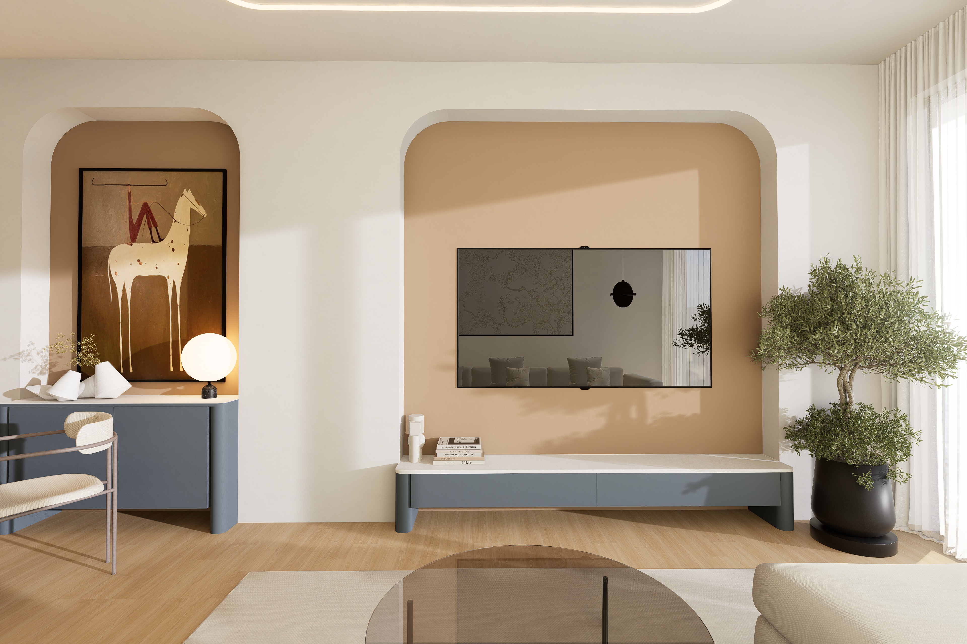 ultra realistic interior render of a refined modern living space keep the exact same camera angle composition wall shapes furniture placement proportions and design language from the input image do not redesign or move anything scene description a warm minimal interior with two large rounded wall niches left niche muted warm brown beige background with large framed horse artwork dark blue grey custom console below decorative objects table lamp with glowing white sphere and an accent chair in front center niche soft peach beige background with wall mounted flat tv and long low blue grey media console below right side large indoor olive tree in black planter near full height sheer curtains foreground partial cream sofa light textured rug smoked glass coffee table floor light natural wood with subtle grain materials finishes walls smooth matte warm white plaster niche back panels warm earthy beige peach tone matte finish consoles desaturated blue grey lacquer smooth satin finish rounded edges floor light oak wood natural matte finish rug soft off white woven texture sofa cream textured fabric coffee table smoked glass top with minimal dark structure planter matte black chair thin metal frame with light upholstered seat back artwork frame slim black frame lighting strong natural sunlight entering from the right side creating realistic soft edged shadows on walls console and floor warm ambient daylight balance subtle glow from the decorative table lamp on the left console soft indirect ceiling led cove lighting very refined and realistic no overexposure realism requirements photorealistic architectural visualization real natural shadows and bounce light accurate reflections on tv and smoked glass table visible material depth and micro texture clean but believable imperfections for realism high end interior photography look sharp crisp 4k quality strict instructions do not change colors do not add or remove furniture do not alter the niches tv wall artwork or planter do not change styling do not change perspective only enhance realism lighting materials and rendering quality add this at the end too strictly preserve original interior design and camera only make it ultra realistic