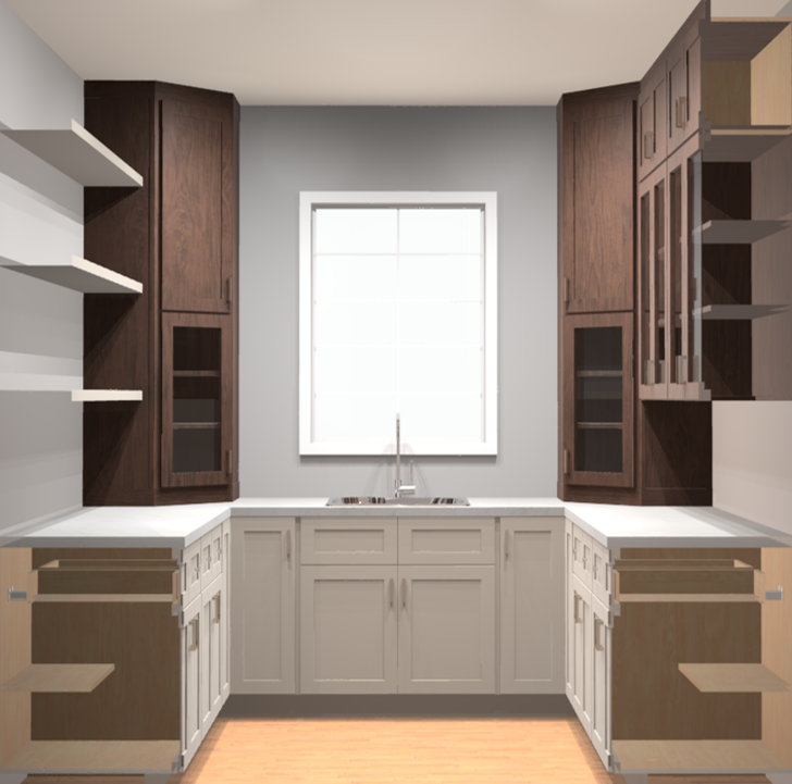 change the floating shelves to match the wood cabinets show a sunrise over a treed hill outside the window change the top doors on the upper cabinets to be glass front doors just like the ones below them change the sink to a white apron style cast iron with brass faucet