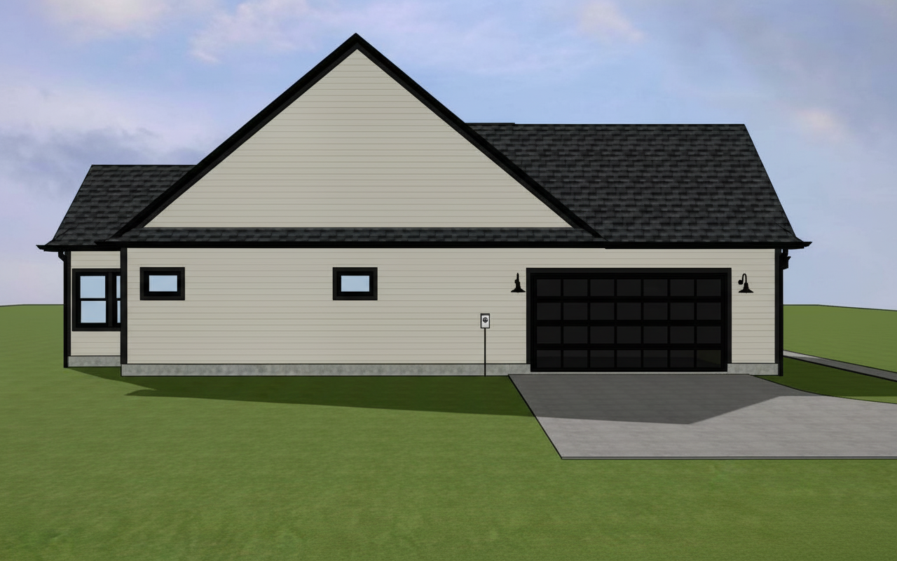a charming modern house with clean lines and a minimalist design the siding is a soft beige complemented by a deep charcoal gray roof the windows and garage door are framed with sleek black trims offering a striking contrast in the front yard the lush vibrant green lawn adds a touch of nature the driveway is a smooth cement gray blending seamlessly with the understated elegance of the house the sky above is a serene blue with gentle pastel clouds creating a peaceful and welcoming atmosphere