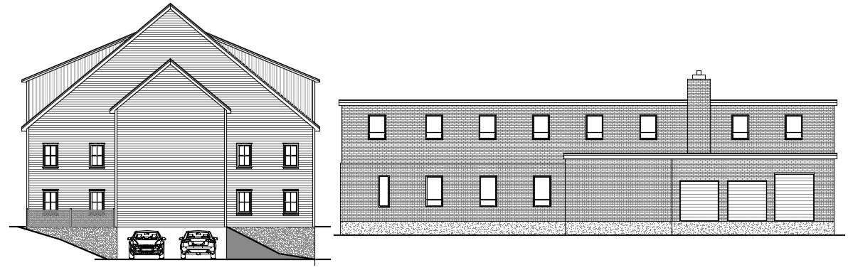 create a real picture the building on the right is brick and the building on the left is blue grey with black framed windows architecture