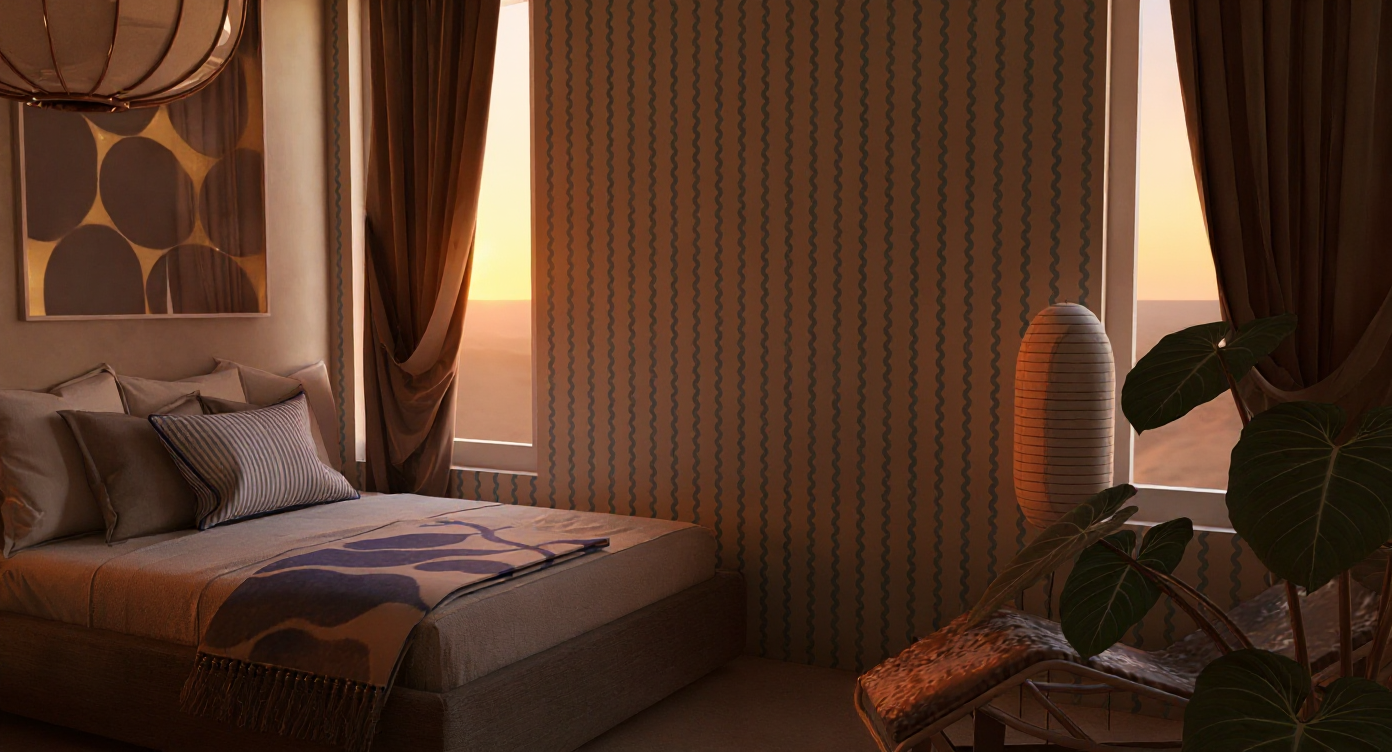 photorealistic bedroom interior based strictly on the provided image preserve all furniture layout materials colors proportions decor textiles and camera angle exactly as shown do not redesign replace or stylize any elements lighting primary focus transform the lighting to be warm and cohesive dominated by soft amber golden and muted yellow tones emitted naturally from the existing light fixtures table lamps and ambient sources lighting should feel realistic and practical with warm pools of light gentle gradients and natural falloff across the room avoid harsh contrast bloom or overexposure daylight exterior replace the exterior view beyond the windows with a desert sunset environment warm sky low sun soft haze subtle orange peach tones exterior light should softly enter the room complementing the warm interior fixtures without overpowering them materials realism subtle fabric texture in bedding and curtains slight wrinkles and weight in textiles soft edge transitions no razor sharp lines natural wood grain variation no glossy or plastic surfaces camera realism natural exposure and white balance 35mm lens equivalent minimal depth of field calm residential photography feel final output must resemble a real professionally photographed bedroom at sunset warm serene and natural not cgi not cinematic not stylized