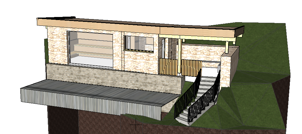take the rendering and edit it precisely an outdoor sauna building in a garden featuring a natural stone facade larch wood roof and columns and a black metal attic trim the windows are mirrored and reflective with no visible frames or profiles frameless glazing scandinavian inspired architecture with clean lines minimalist design and natural materials color palette in neutral earth tones with warm wooden accents the atmosphere is cozy inviting and harmoniously integrated into the garden landscape with soft daylight natural shadows and surrounding plants grass and stone details without any furnitures architecture