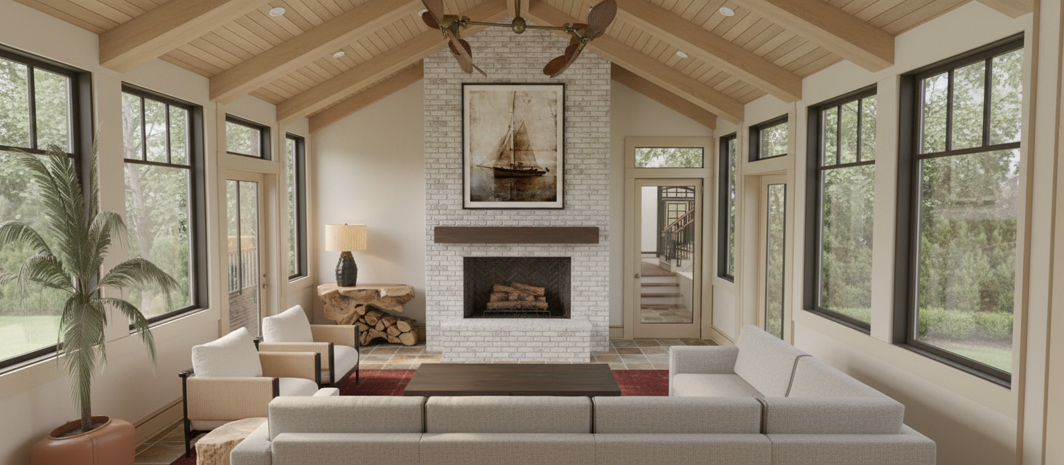 can you make this look more realistic as if taken by a camera add a timber framed decorative truss in the gable of the porch stone on the entire front where the plywood is shown and on the porch posts add some rural trees in the background