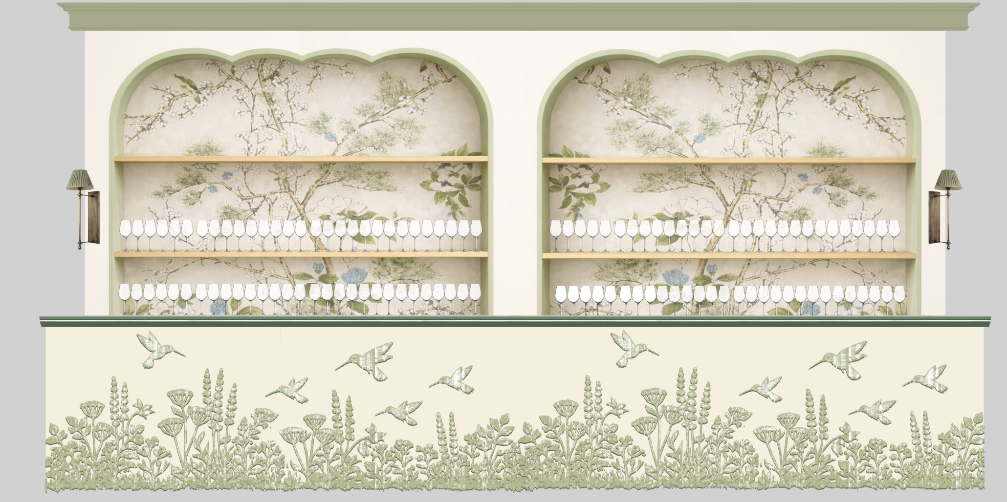 this is a bar with shelving behind it the bar front pattern is green on an ivory backing render in sunset lighting