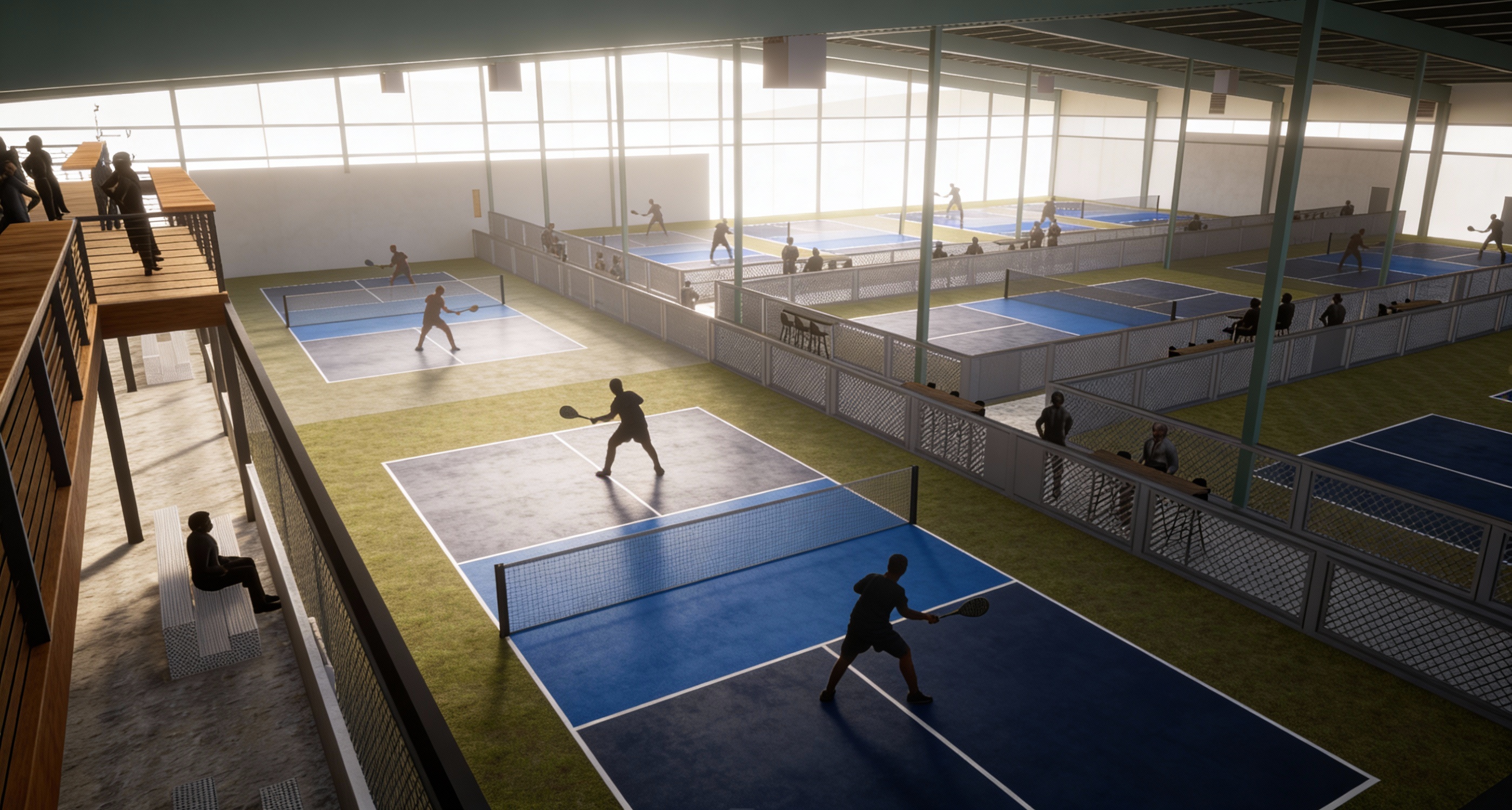 land slopes down behind building with trees in the distance