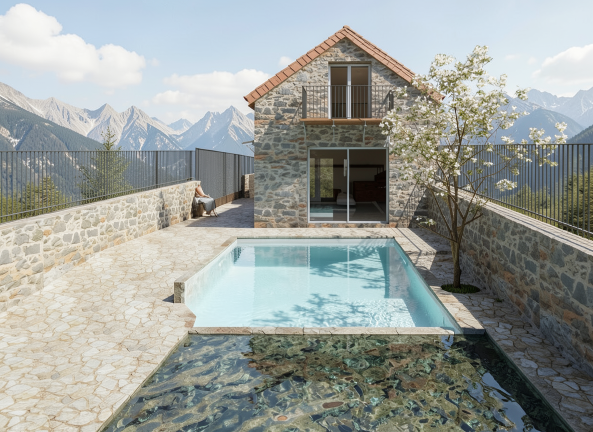 the swimming pool is at the front of the photograph in the rear there is paved area