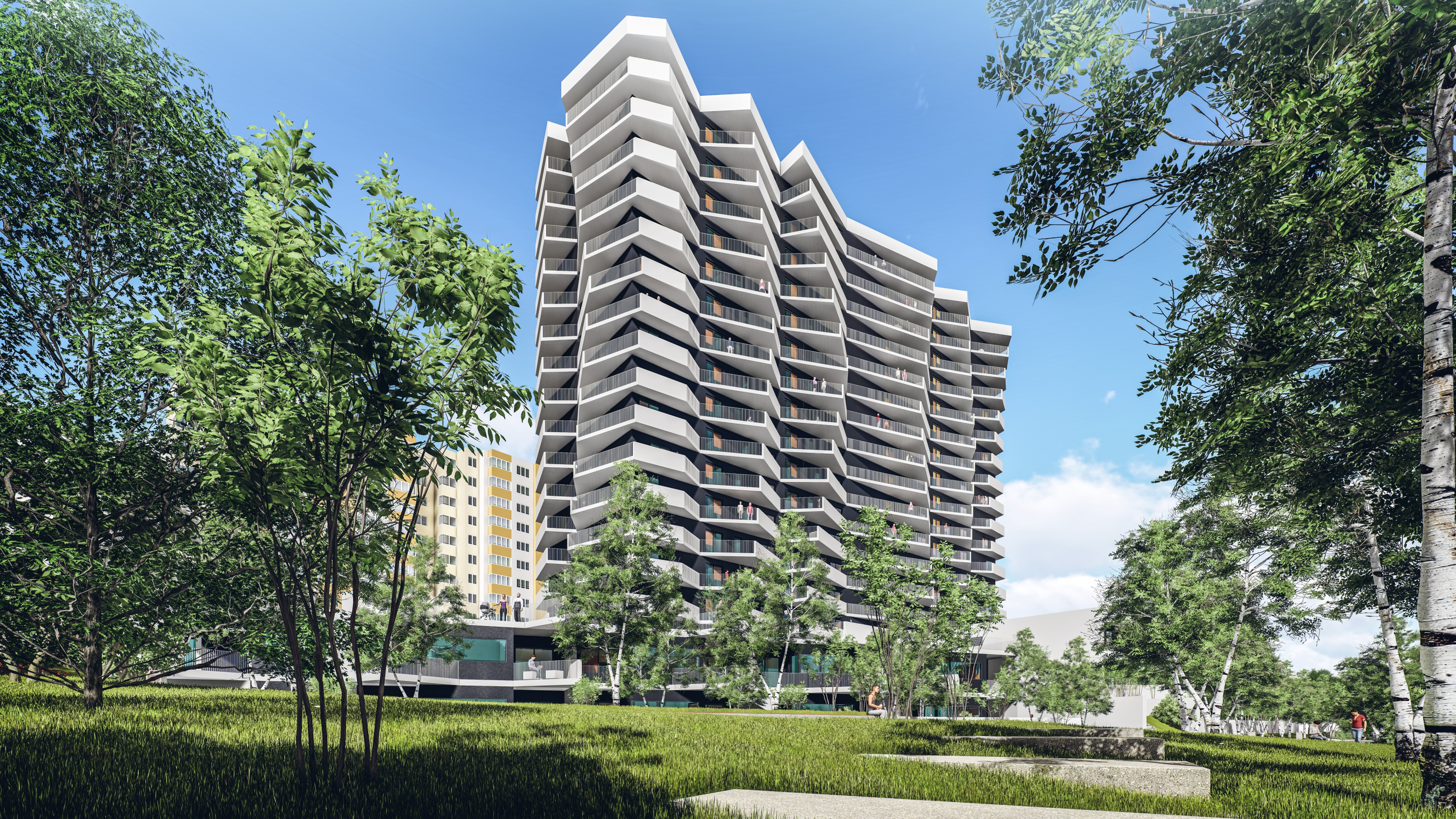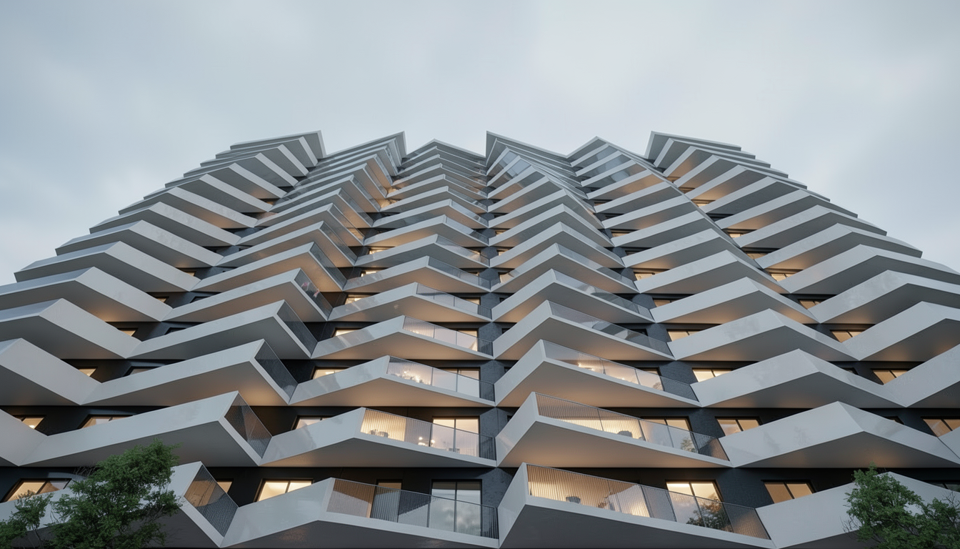 important preserve the existing geometry and the existing context exactly as provided do not modify alter reinterpret add remove scale or reshape any geometry do not change the site surroundings street layout neighboring buildings vegetation or context elements do not modify geometry scale proportions buildings road layout sidewalks or surrounding context in any way do not change text photorealistic architectural rendering clean and balanced contrast calm cinematic mood style contemporary european residential architecture minimalist premium understated soft overcast noon atmosphere diffused natural daylight with subtle blue grey tones cinematic architectural mood large glass surfaces with realistic reflections soft mirror effect subtle environmental reflections of sky and surroundings wet pavement with smooth reflective surface soft light bounce and blurred reflections high dynamic range lighting realistic global illumination soft shadows calm and minimalist nordic mood photorealistic architectural visualization balanced exposure no harsh highlights add interior warm light do not modify text do not add a road