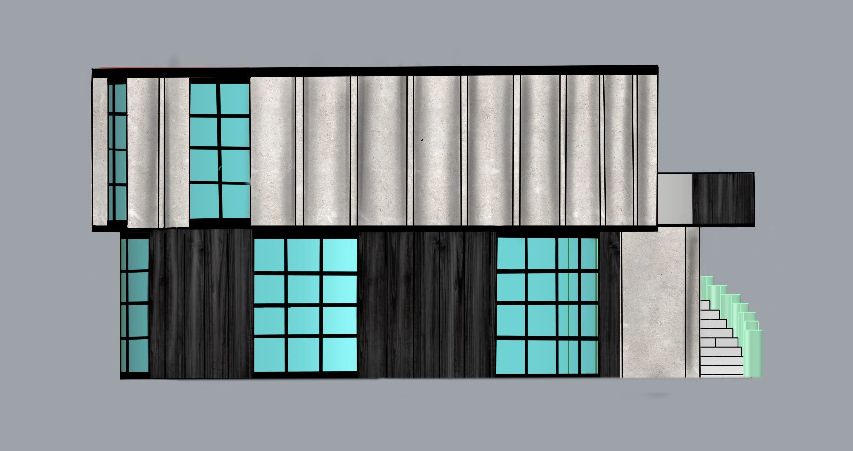 make sunny and add trees exterior shot apply soft daylight with slight haze desaturated earthy tones and a cinematic mood emphasize minimalist composition muted colors and flat entourage silhouettes that blend graphically into the scene reduce hyper real reflections and glossiness adding subtle film grain for a photographic feel final image should feel like a conceptual architectural visualization calm atmospheric and editorial