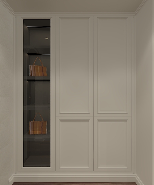 make more realistic use warm light ambiance enhance white the classical modern do not change any design or layout from the existing image white paint doff cabinet with gold handles flooring using wooden walnut matte finish with fine pattern in it create a general modern classic design ambiance the glass door is a beveled clear glass
