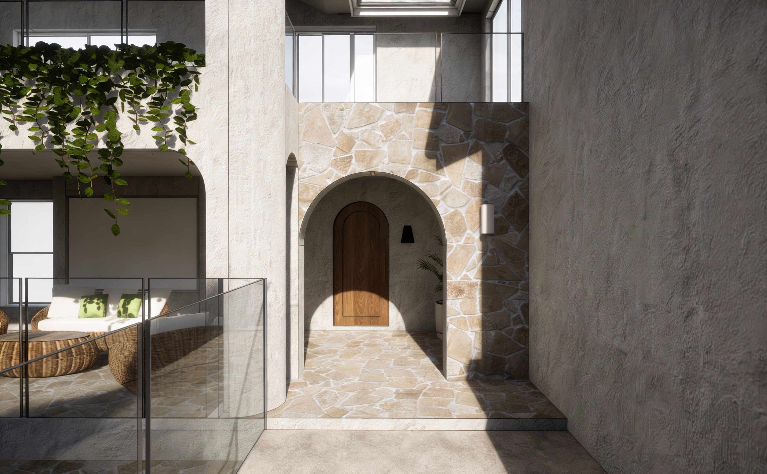 render a photorealistic 3d perspective of this house in the austrian alps surrounded by trees on the right handed side and meadow on a slope in the back add conrete stair on the left side to get up in the garden reference the current material style just enhance them verticle wood siding white walls keep model geometry the same windows doors roof walls garage door pavement driveway make a lush vegetation that looks native to austria tyrol do not change the view only enhance the current materials and make the landscape nicer vegetation detailed textures in the wood siding and glass reflections and a vibrant clear sky with light atmospheric depth render in hyper realistic architectural visualization quality 8k resolution