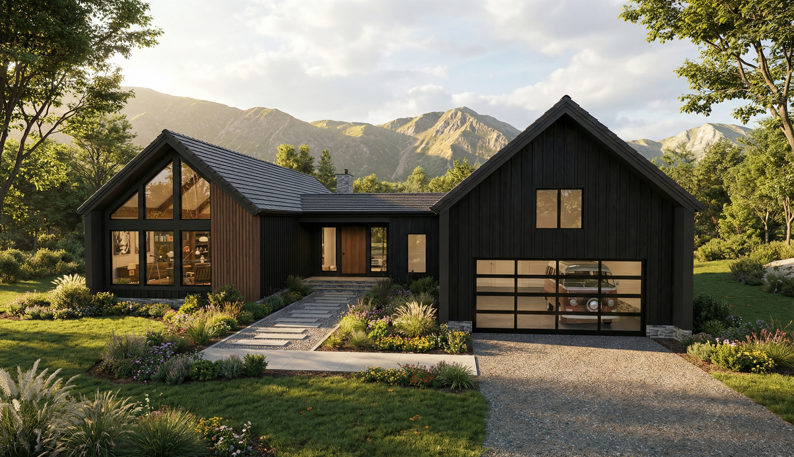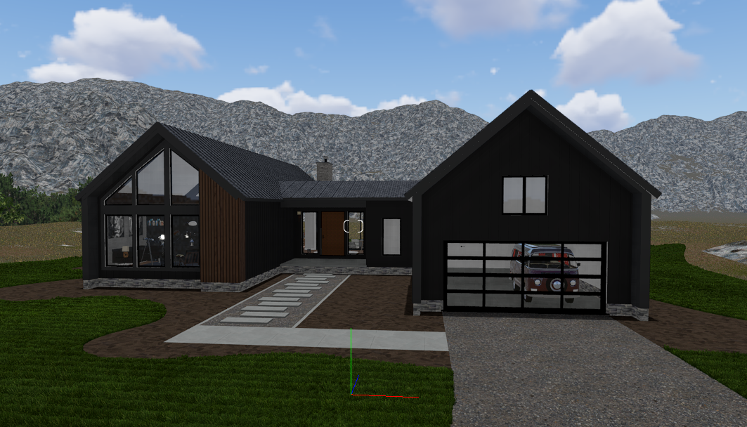make as photorealistic as possible while keeping textures the same as selection professional landscaping in a lightly wooded scene with good lighting match materials to plan remove the car from the garage