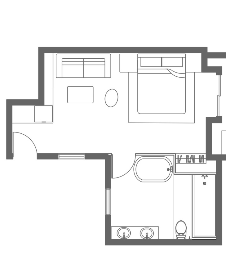 convert this floor plan into a realistic isometric 3d view of a bedroom show the space from an elevated angle with furniture walls and details visible private hotel room intimate and quiet retreat low bed integrated into architecture headboard as sculptural stone element soft diffused lighting feeling of protection and enclosure use the same furniture as shows on the plan do not change the orientation of the floorplan
