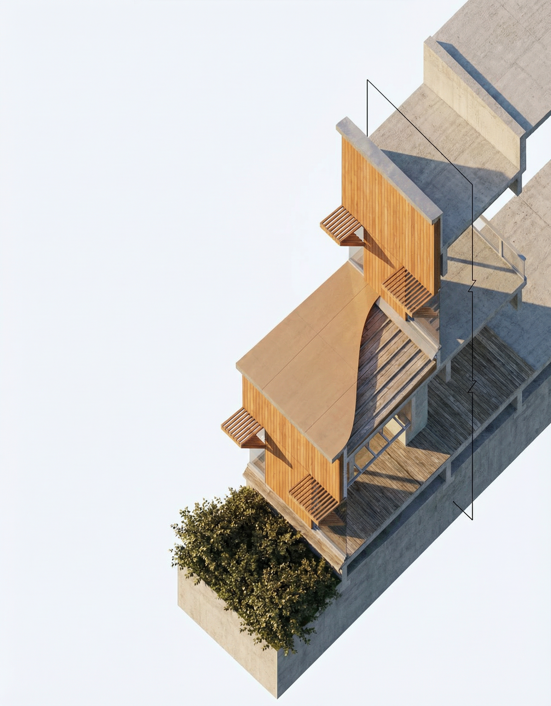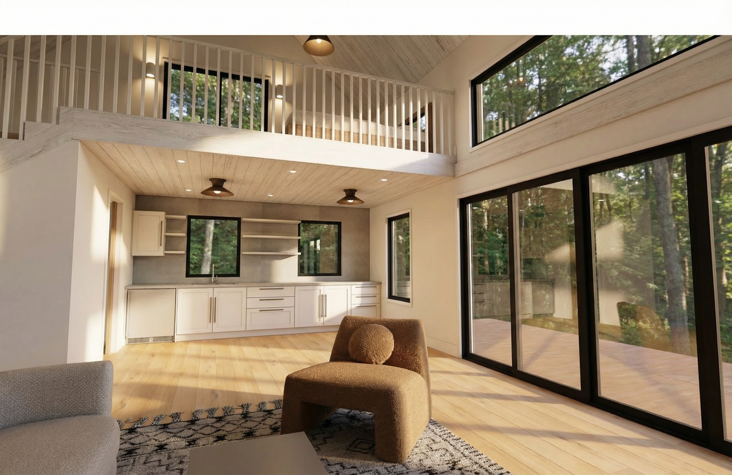 daylight forest background keep existing materials white railing white washed wood roof