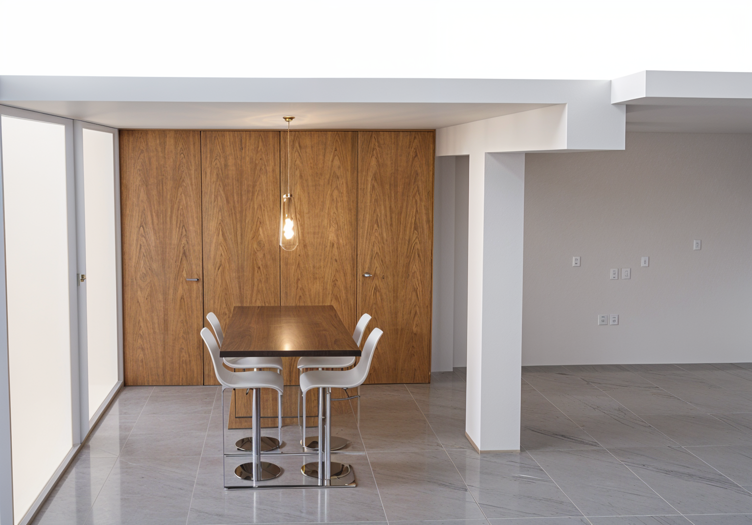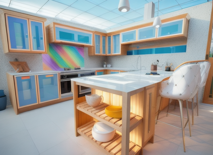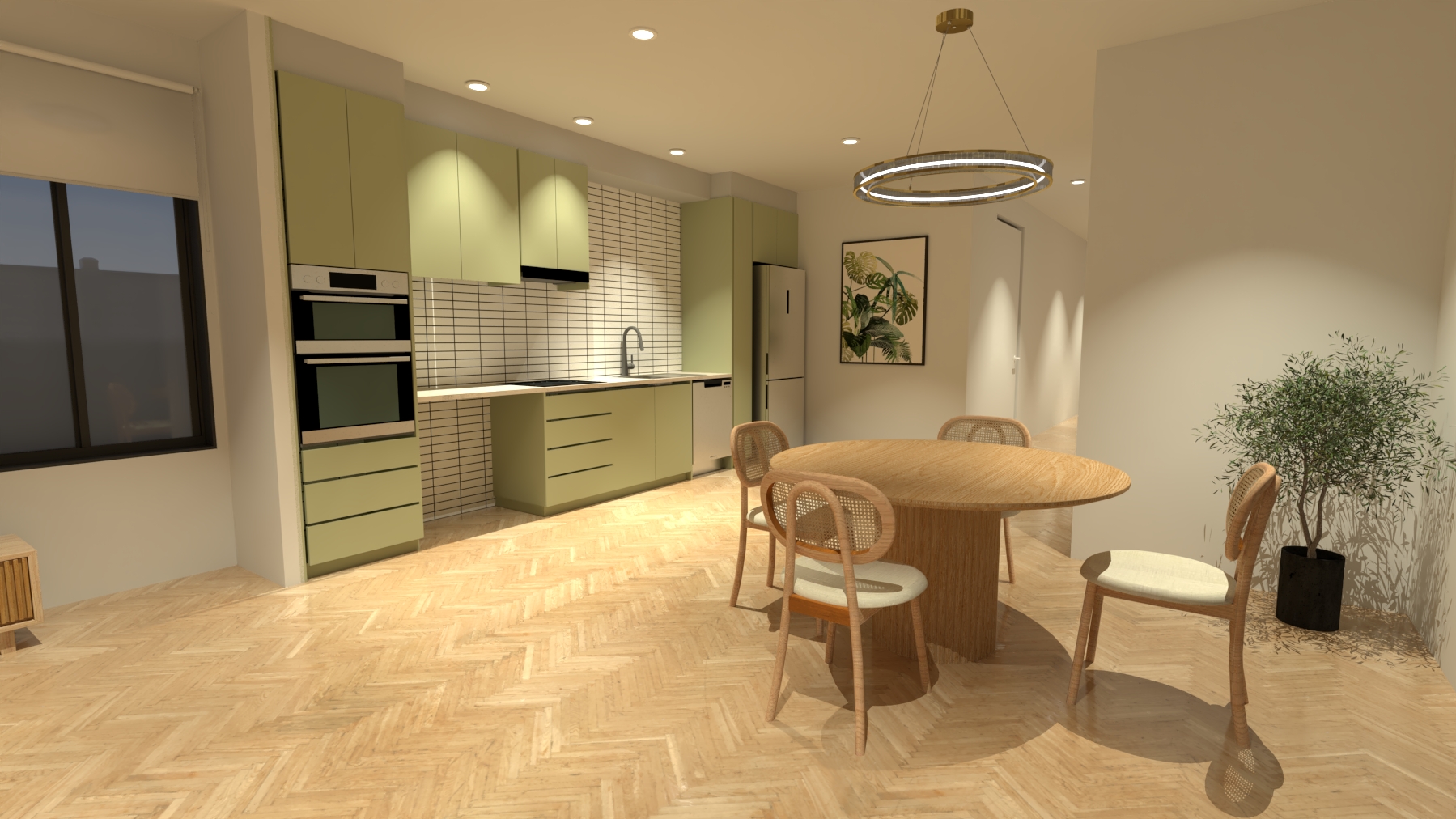 fix the lighting add a small plant pot on the dining table change the cabinet color to light olive green