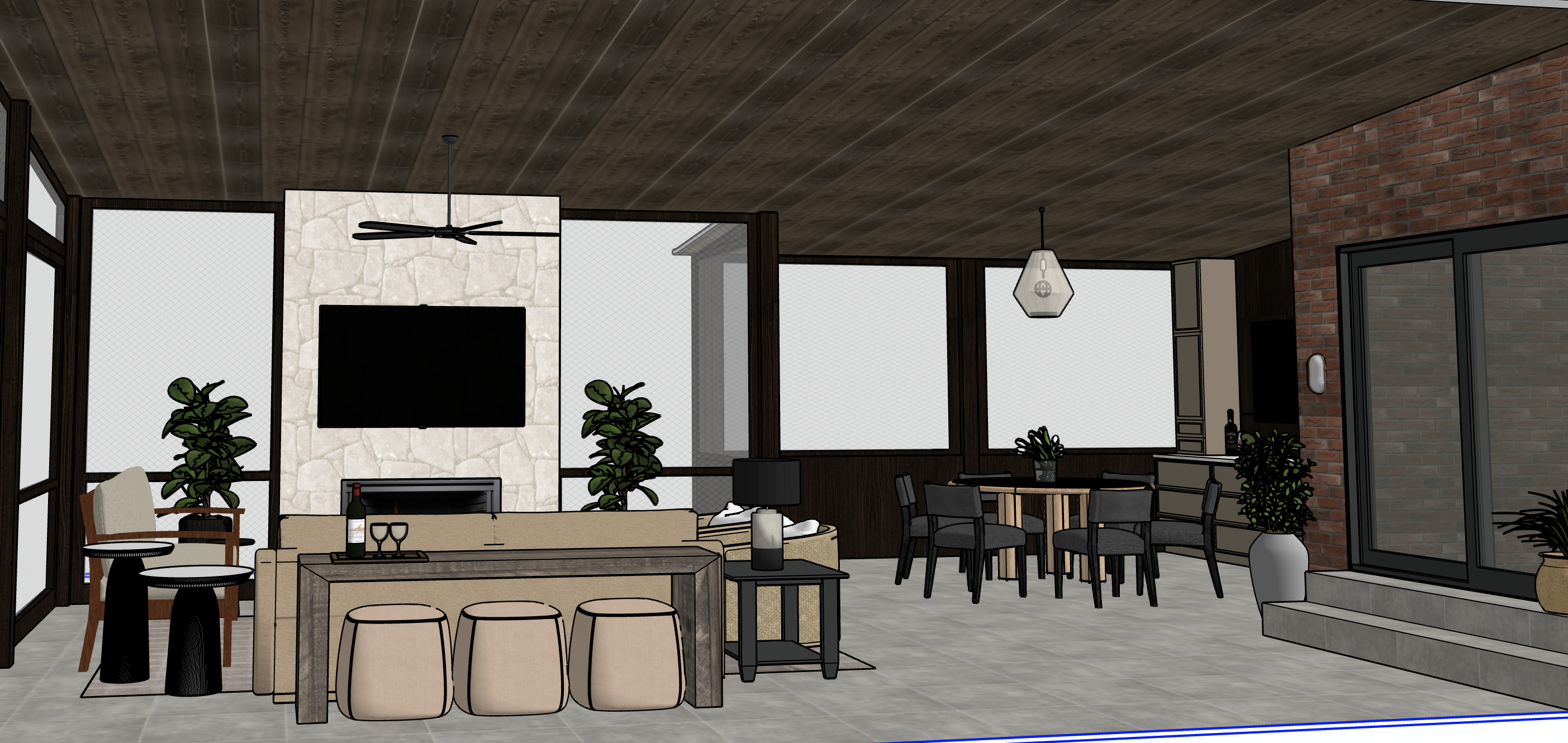 add a backyard landscape outside of the screens it should appear as if you are looking through a screen slightly faded not just a clear window this is a screened in porch rendering use soft mid day lighting add dark brass hardware to the cabinetry on the right hand side