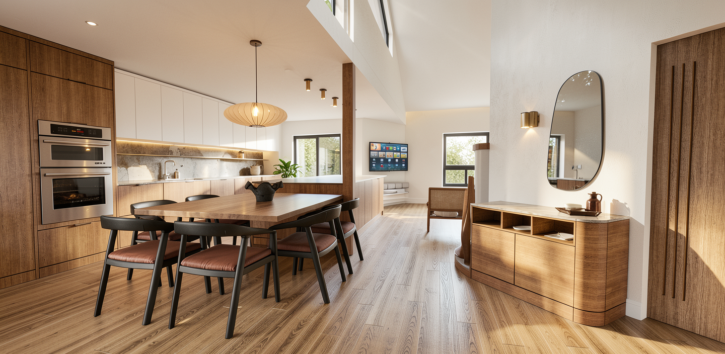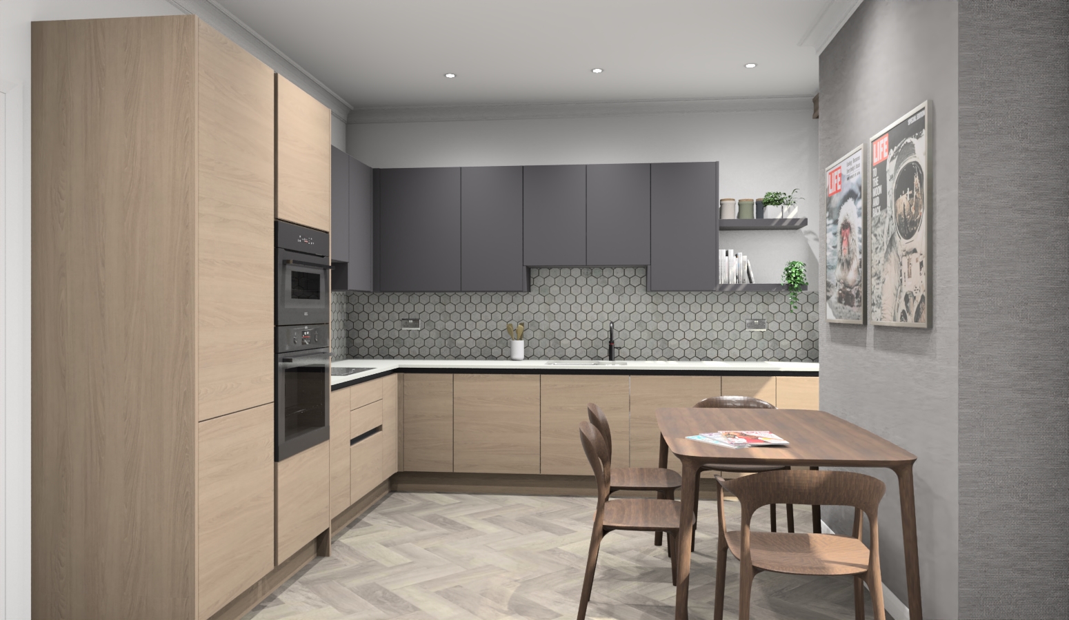 make this image 8k hyper realistic as if it were taken via an iphone camera artificial lighting should beautifully blend with natural lighting showing the subtle grain effect on the painted ash kitchen door keep dimensions the same and in a landscape format keep dimensions the same midday sunlight coming through large windows casting realistic shadows and reflections shot with a dslr camera 35mm lens shallow depth of field ultra high resolution photorealistic ray tracing global illumination highly detailed textures realistic lighting cinematic composition