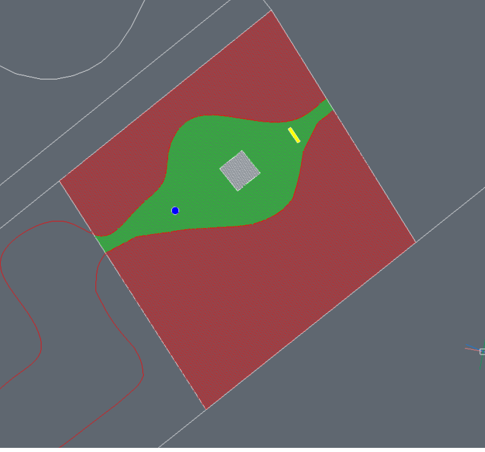 erstelle eine minifussballgolfbahn die gr ne fl che ist die spielbahn die rote fl che ist das rough h heres gras der gelbebalken ist die abspielfl che der blaue punkt ist das loch die graue fl che ist ein kieshindernis mit den abmessungen von 3m x 3m