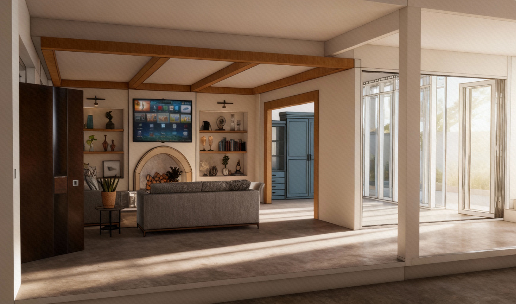 architectural rendering of a small contemporary research station perched on a rocky cliff structure made of warm wood black steel and glass precise and realistic architectural detailing cantilevered over stone terrain supported by steel beams surrounded by mountain pines and mist below rendered with crisp building geometry and realistic materials background and edges dissolve into loose watercolor washes and white paper edges not full bleed with soft unfinished fade around the image visible pencil and ink linework with light technical annotations artistic yet grounded balance of precision and painterly abstraction calm morning light concept architectural visualization style