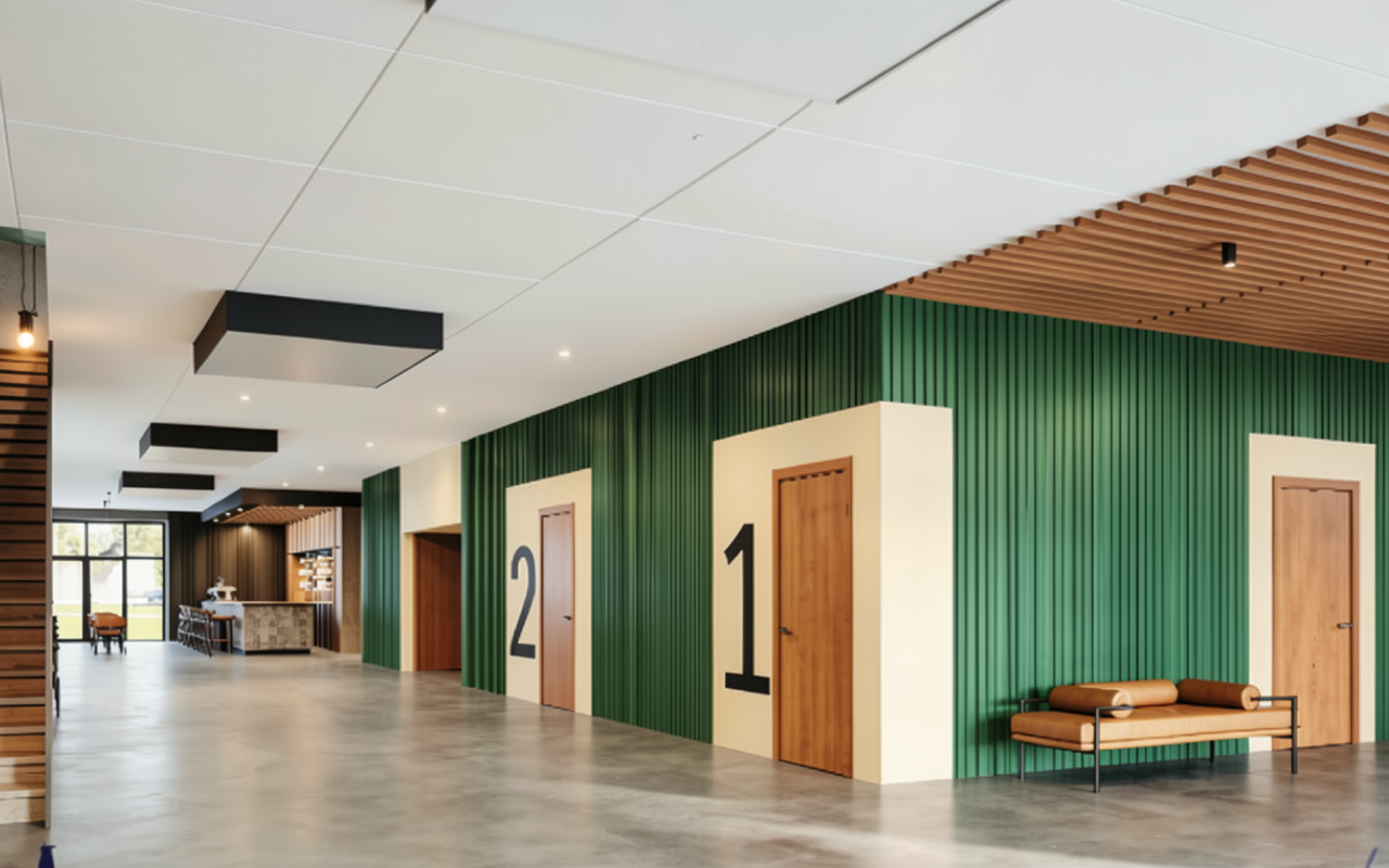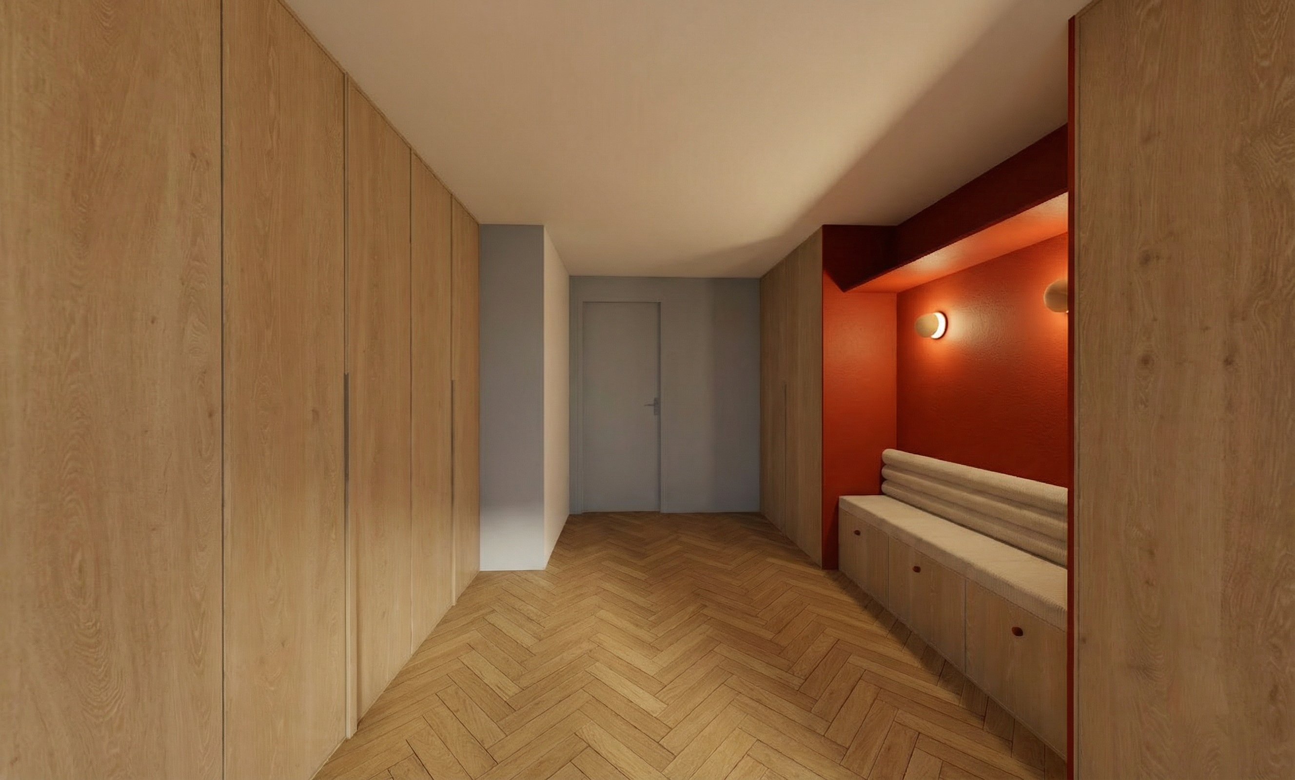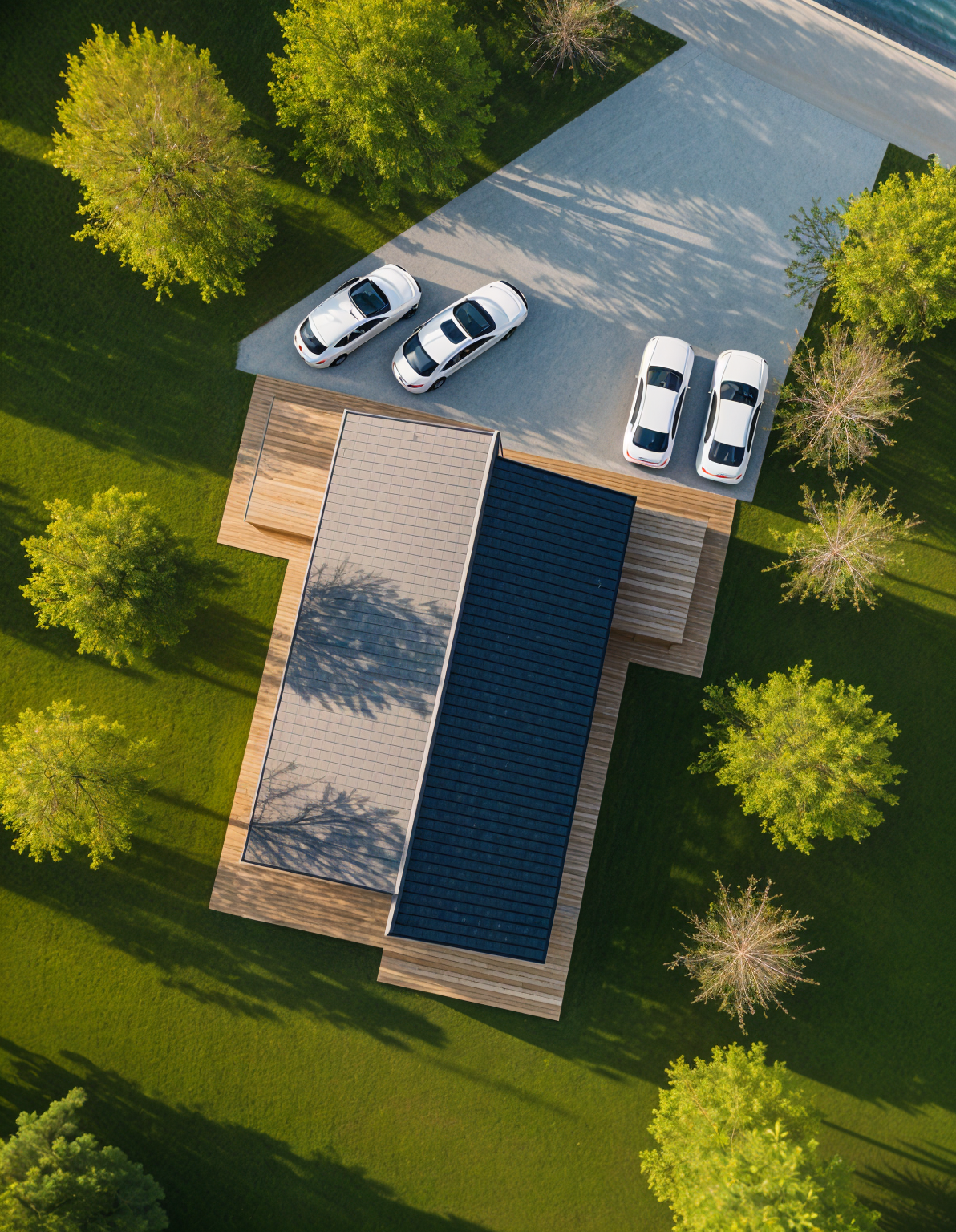 transform this image into a photorealistic rendering keep the same view and don t alter anything the building s walls are clad in wood the window frames are black aluminum the railings are semi transparent glass the fence and columns are corten steel the urban context is within a residential area of abano terme among houses and trees the sunshades are wooden add some details such as cars and people on the right side of the image there s a one way street place a hedge inside the property along the terraces place some tables and chairs and potted plants