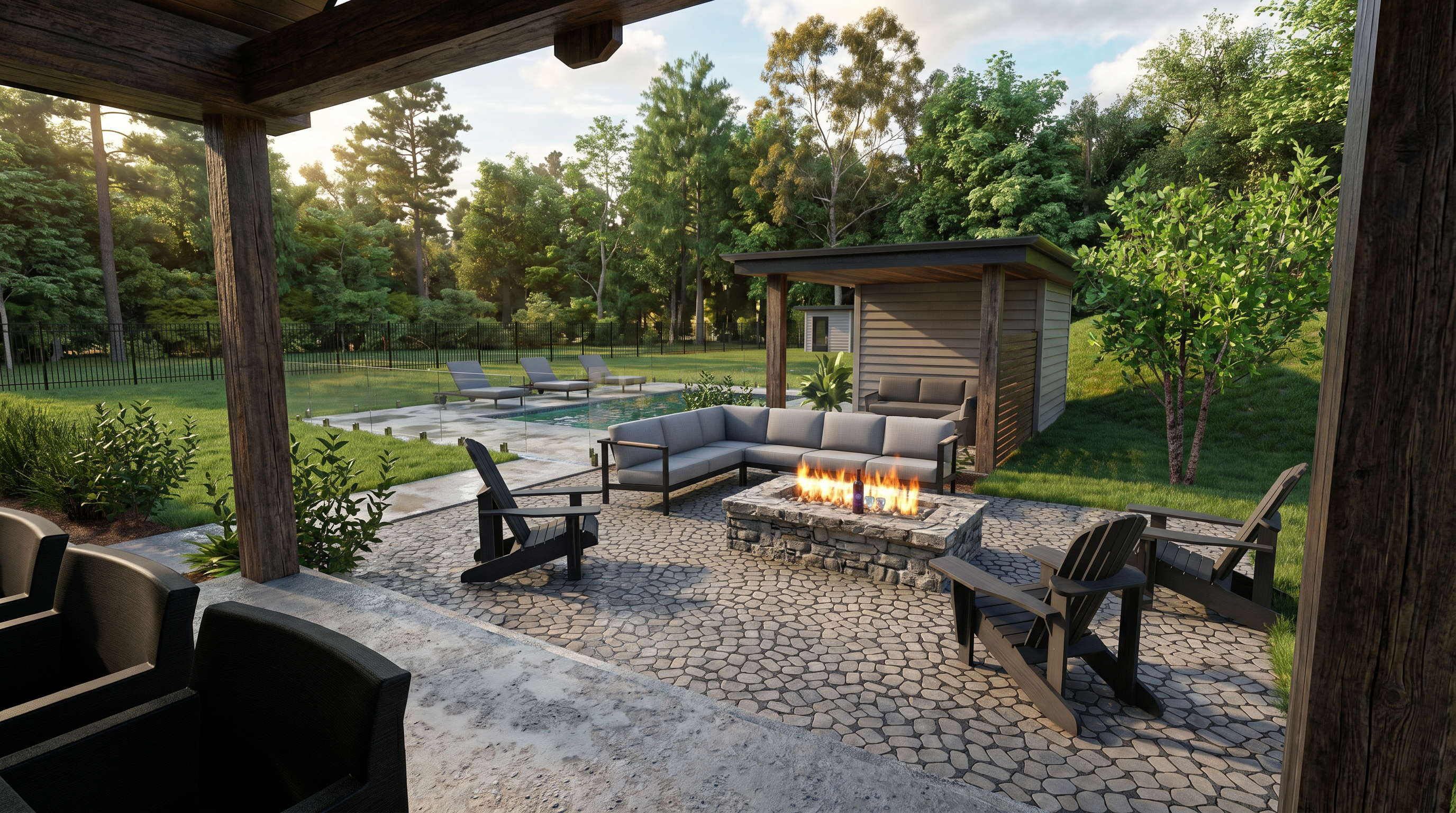render and finish this shot add a dining table grill and people enjoying the deck keep grass on the ground level and an out door living set and a webber grill on the main deck area