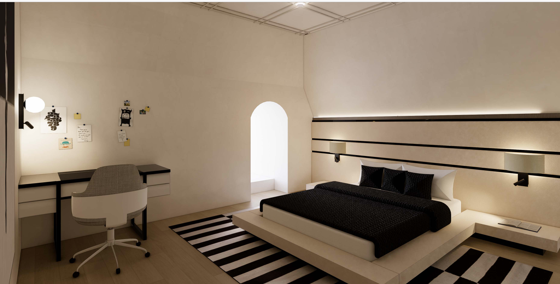 add a built in bunk bed with stairs and make it cool redesign the headboard wall to be an arch with wall paper inside the arch