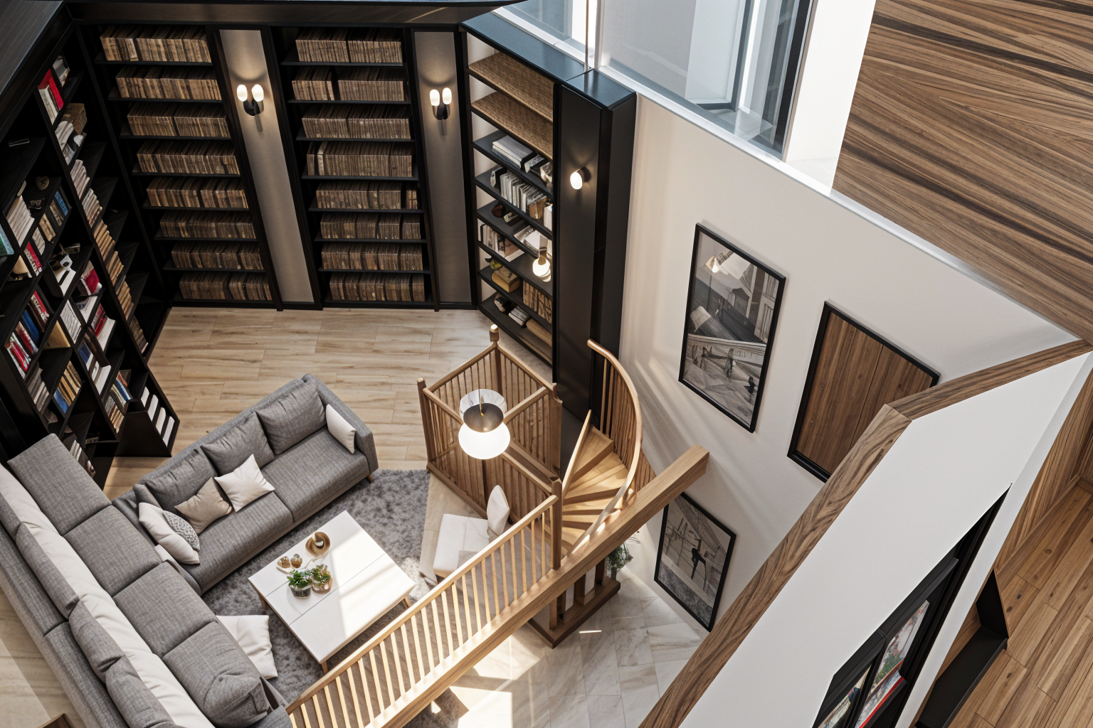 make it into realistic render with modern mid century interior style lighting in round wood on top of ceiling lighting shelves round mirror in the back of the bed