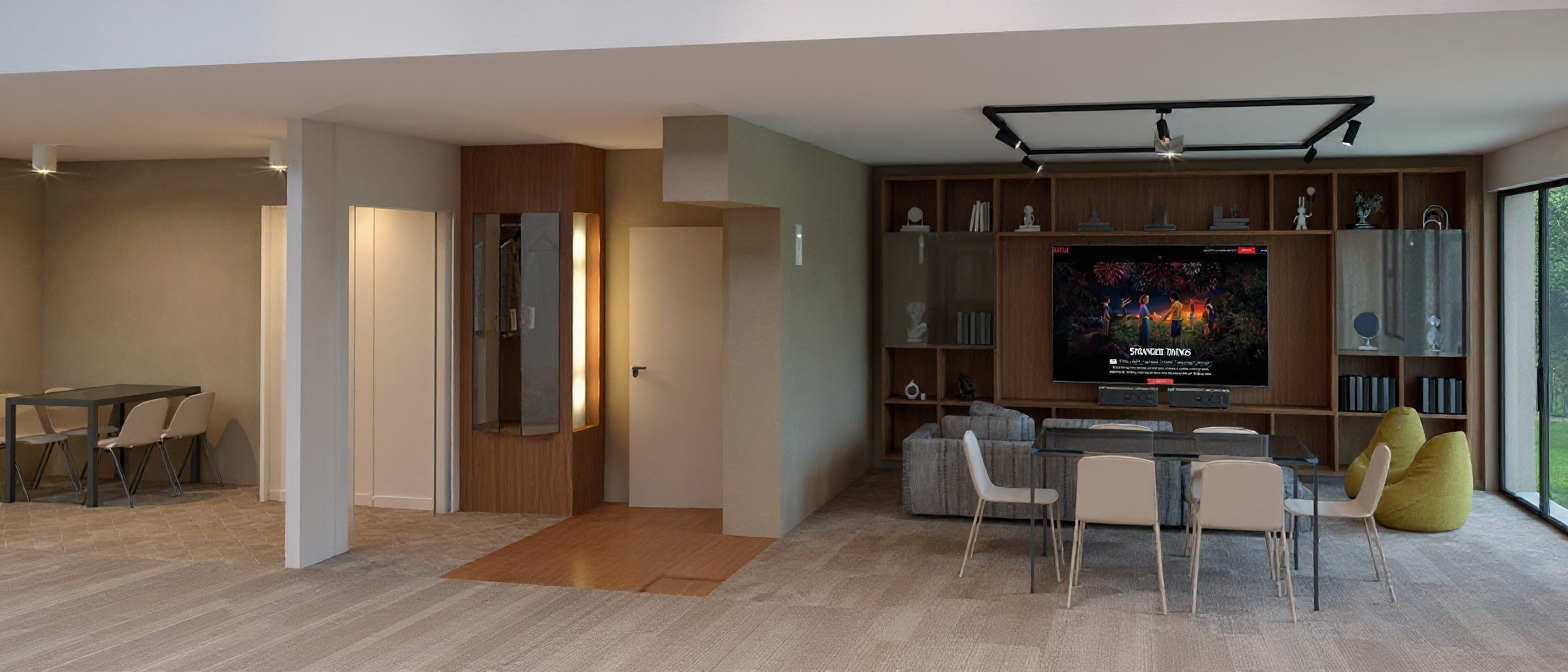 generate a photo realistic image from inside house with fireplace and dining table with surrounding windows and slanted roof that from 2nd floor view the tall trees and mountains maintain a 3 2 aspect ratio for the image