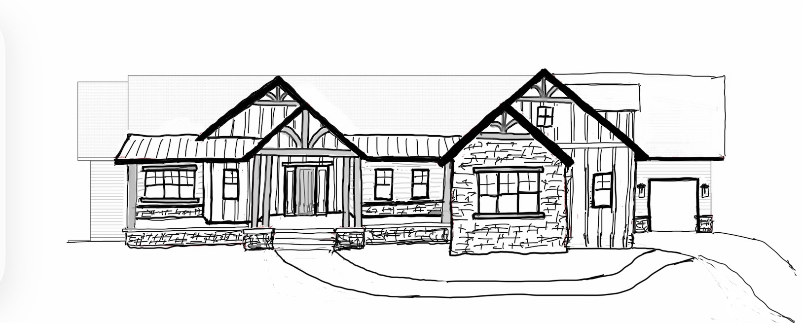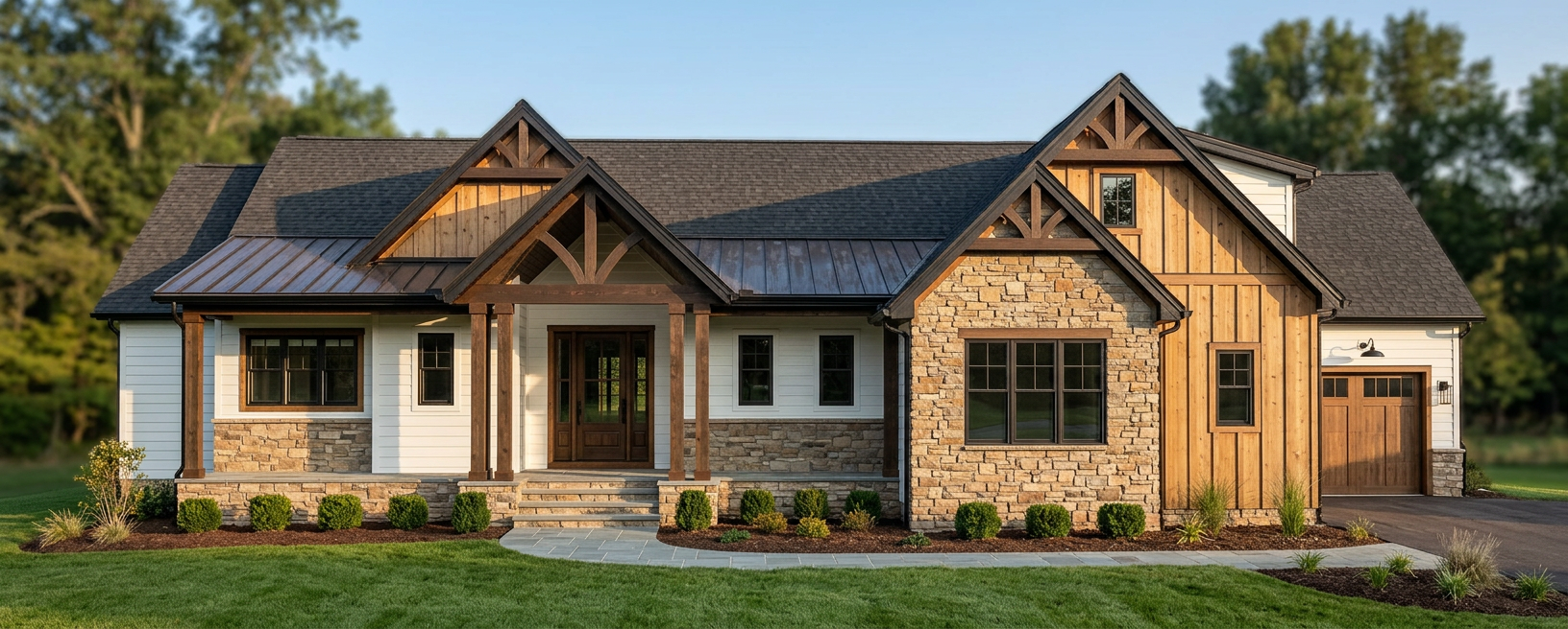 use lots of textures to render this exterior with warm natural tones make the roof dark make the landscaping look crisp and clean