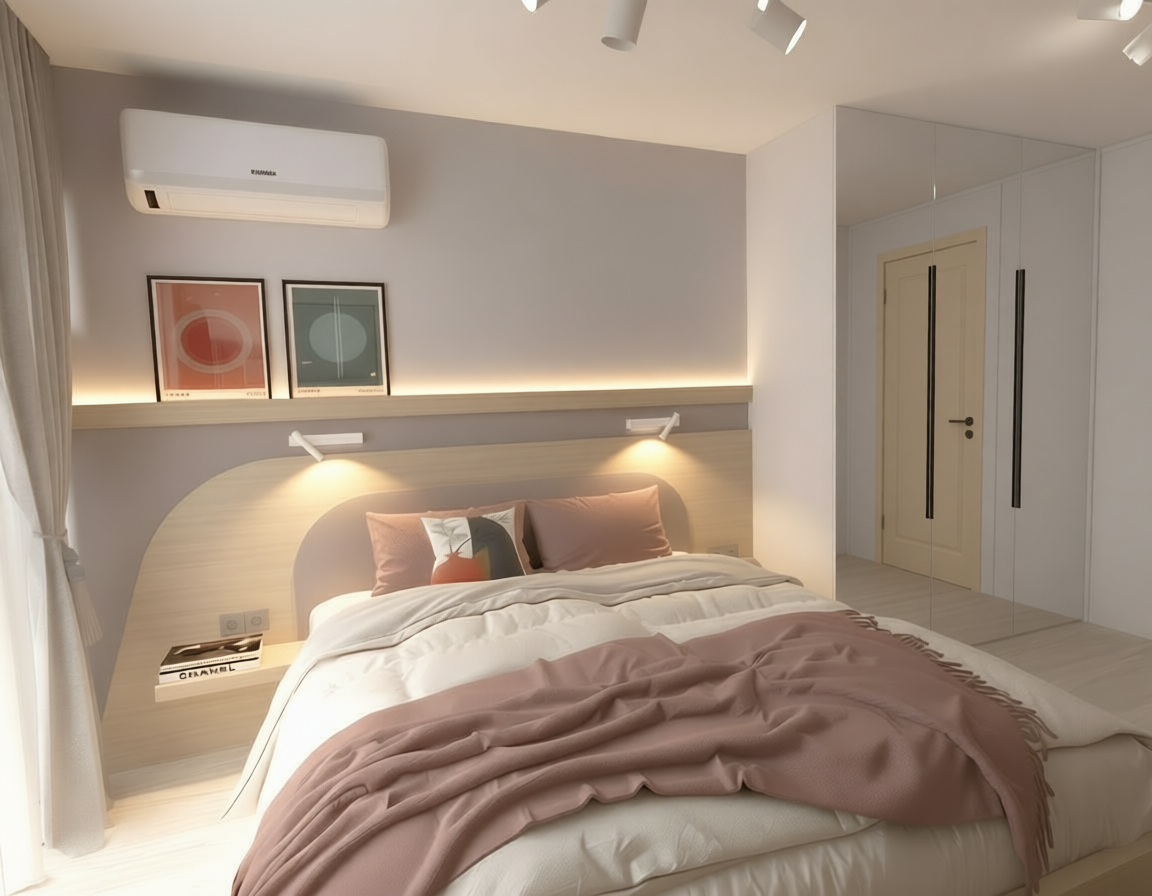 render senyata mungkin dinding off whitwm plafon putih lantai marble krim agak abu dan tarok pajangan di rak kiri dan kanannya dan lampu indirect