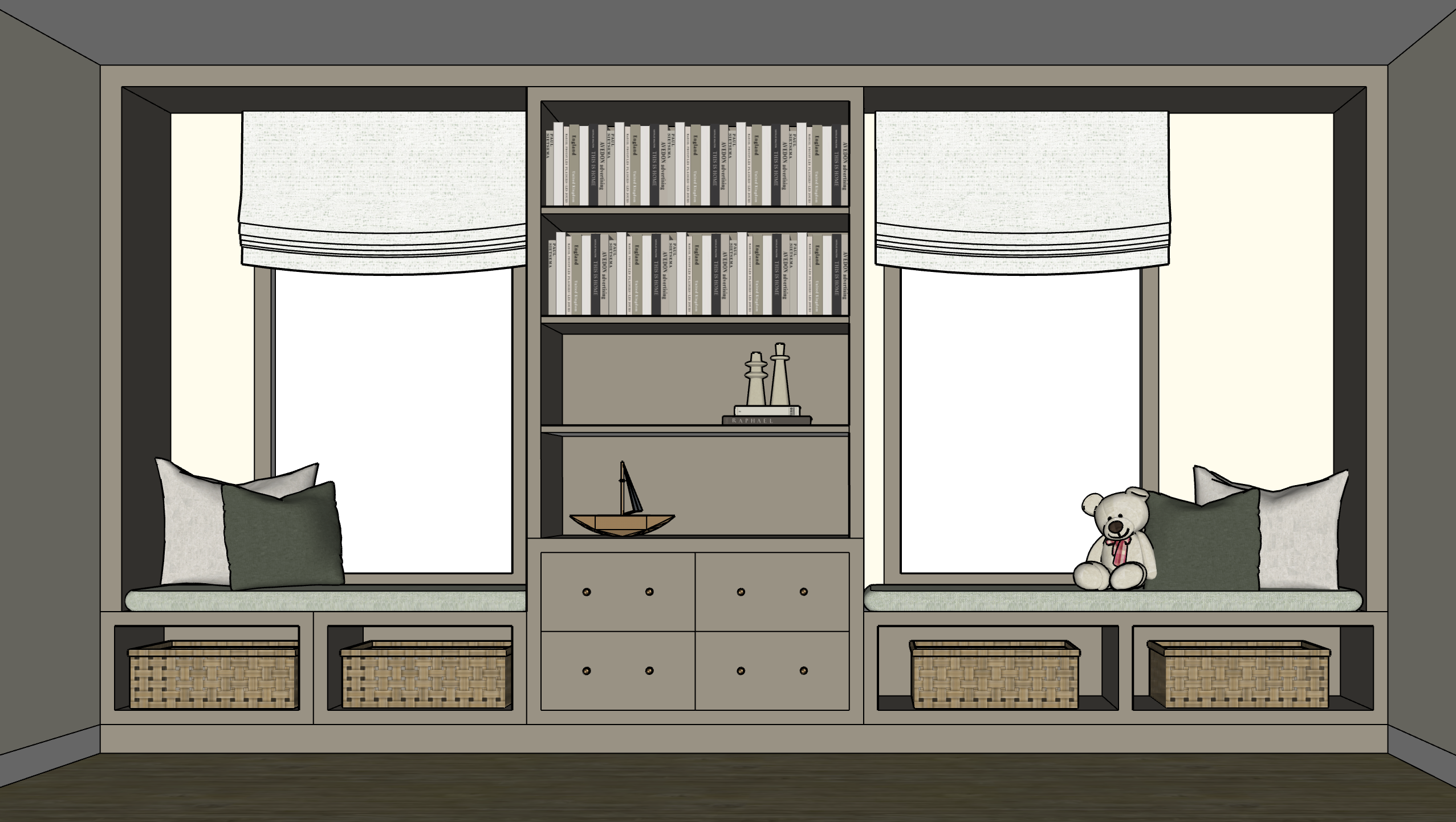 make this look like a hand sketch there should be trees outside the windows and the cabinetry will be painted