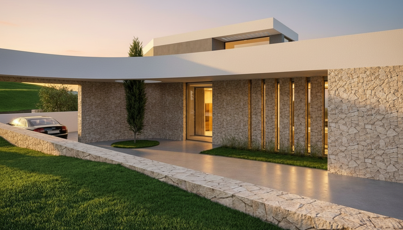 maintain the colours textures and geometry of the image no background no yard or sky leave the background as it is in the image the facia and posts are white grey concrete with horizontal lines on walls with door and window door and garage door are mid tone grey
