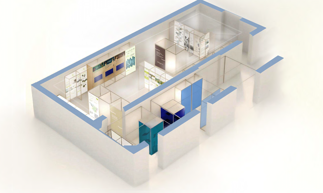 exhibition interior render of a modular display layout with light cream metallic structures ral 1030 and clear wooden accents maintain the existing panels and overall geometry add subtle museum style spotlights above each panel illuminating them gently include two glass display cases peceras at the entrance with softly blurred backgrounds behind them clean realistic lighting high quality architectural render neutral floor and walls minimal shadows balanced composition elegant and professional exhibition design architecture
