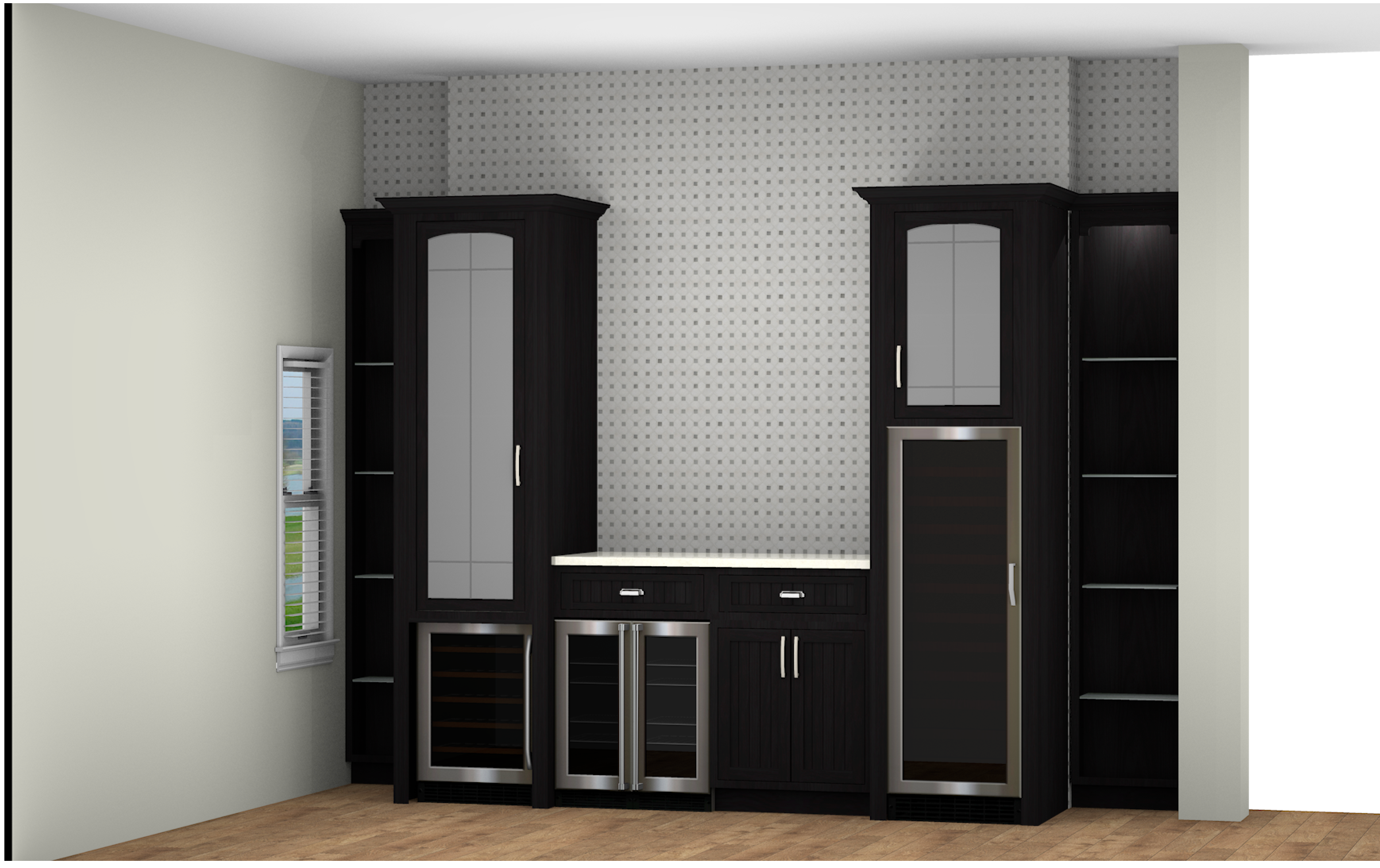add glass shelving between two towers with a nice sconce above stage this as a bourbon bar but keep wine in the tall fridge
