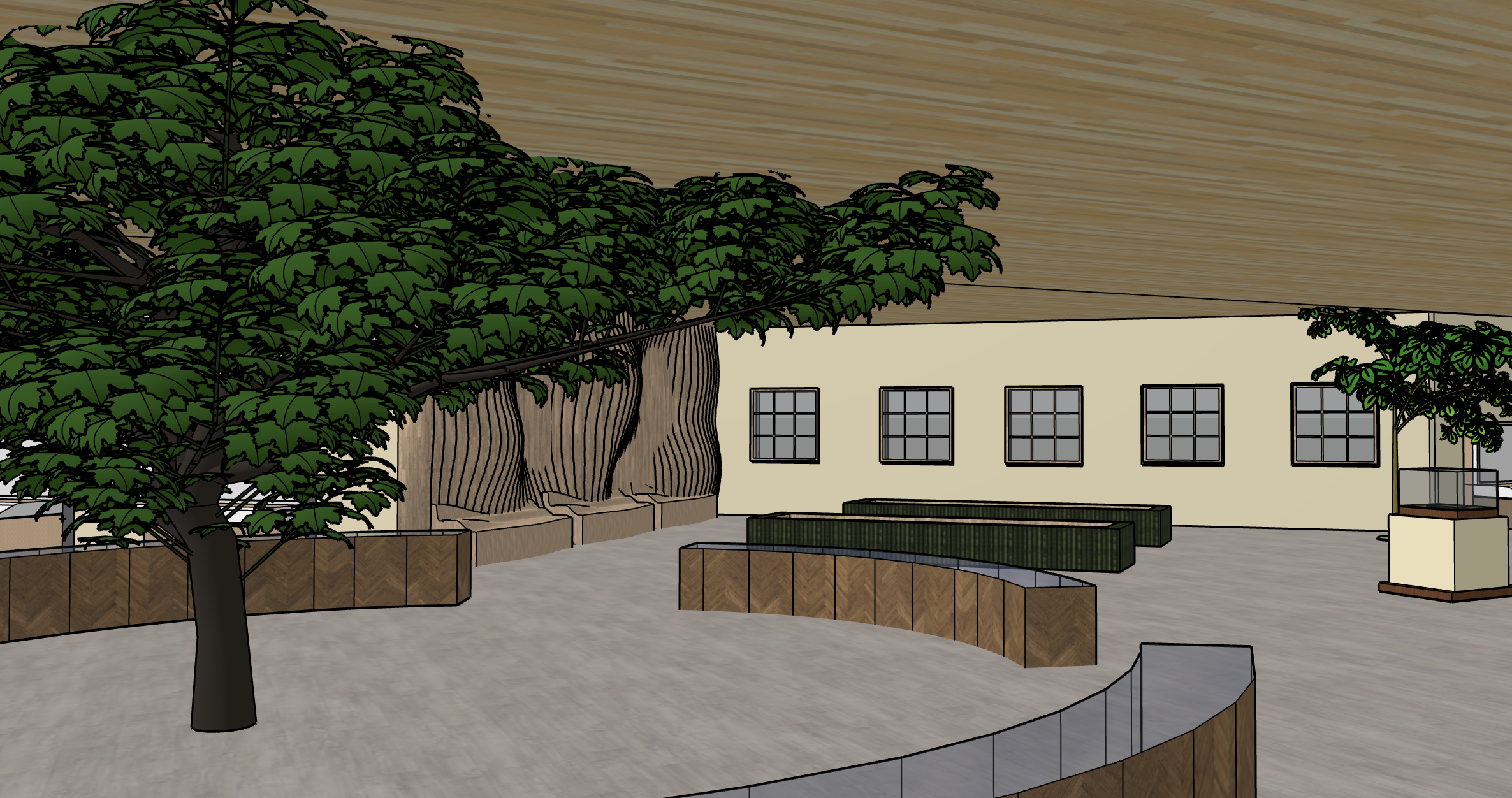 nature museum with a centre piece tree that has a dirt box surrounding it with spotlights facing up towards it the surrounding curved boxes are displays the displays near the windows are a green wood that features things in them where kids can touch to learn about conservation the ceiling is light wood linear veneered panels with integrated recessed lights