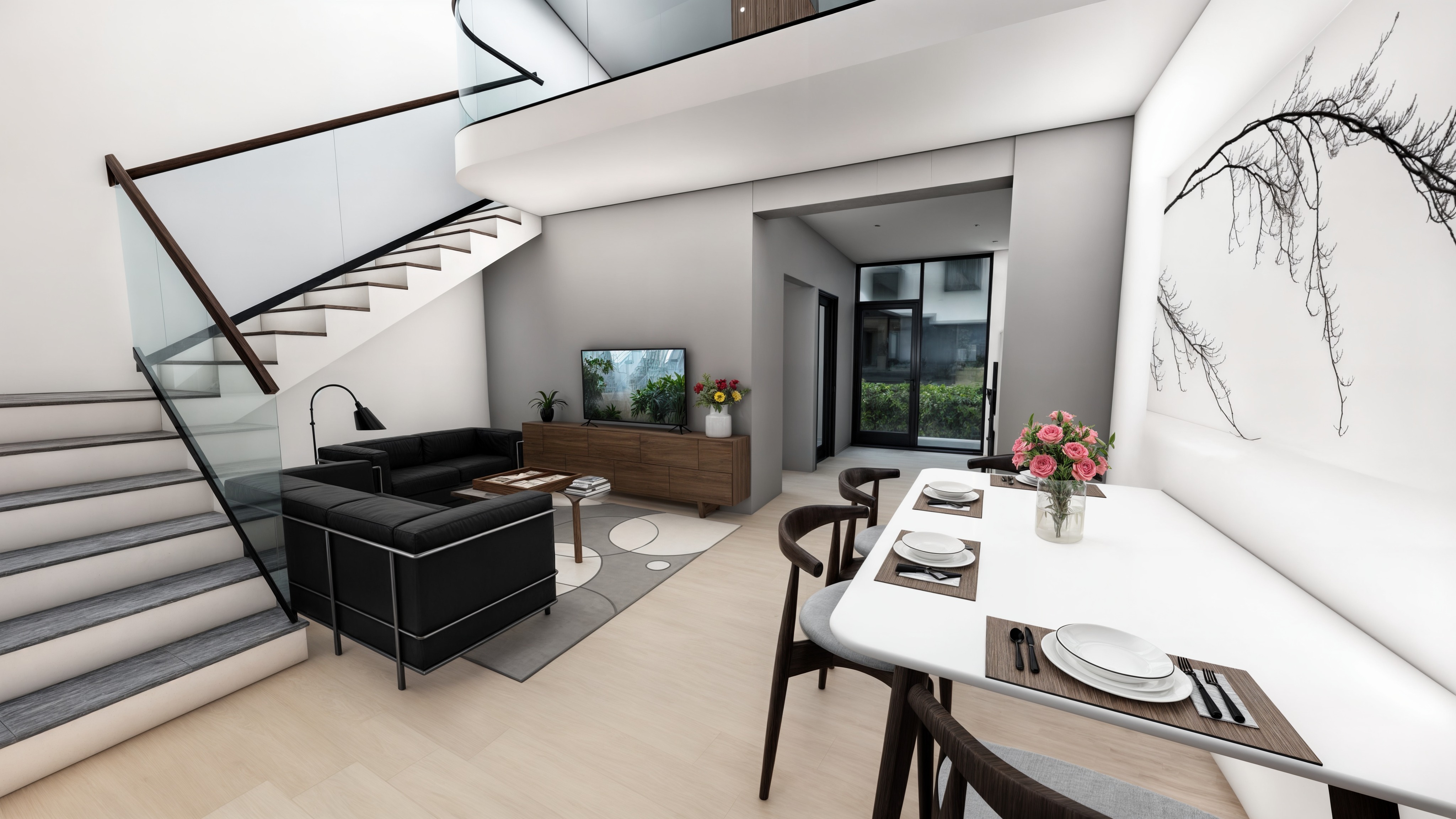 a modern open interior lobby with sleek architectural design featuring smooth gray tiles on the floor and rich wooden paneling on the walls the ceiling is pure white enhancing the brightness while natural light streams through large glass windows framed in black include green potted plants that add vibrancy and life to the space the reception desk is a blend of elegant marble in shades of white and dark blue the atmosphere is professional and welcoming evoking a sense of luxury and comfort