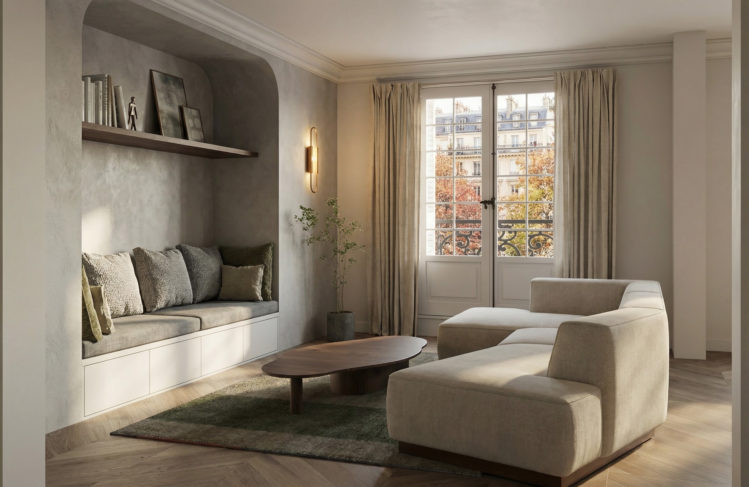 insert a modern outdoor kitchen area in this mediterranean villa exterior context the kitchen must be positioned along the garden side near the swimming pool 11x7 meters aligned with the veranda axis but visually secondary to it design a minimalist black matte metal pergola structure with a flat roof and wooden slats underneath under the pergola create a concrete outdoor kitchen with integrated stainless steel bbq built in sink storage cabinets large monolithic concrete island with seating for 6 8 stools materials must match the house concept light stone flooring natural wood accents matte black metal details warm neutral plaster walls the kitchen must feel architectural not decorative no luxury staging no decorative objects no hanging plants no bar style glamour the atmosphere should be calm mediterranean coherent with villa eos design language the structure must look integrated into the garden and not like a separate object lighting soft natural daylight realistic shadows the outdoor kitchen is functional and elegant but not the protagonist of the space