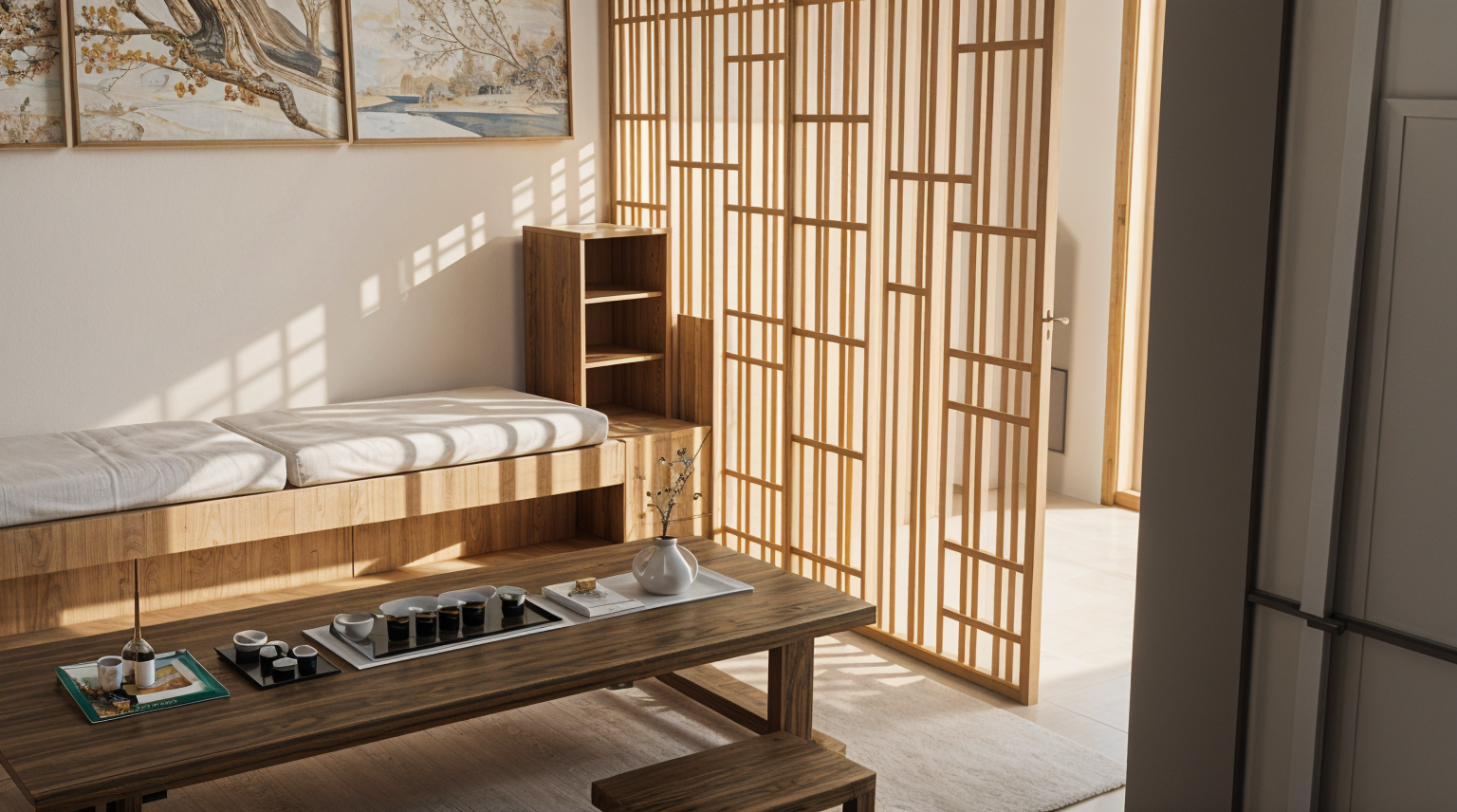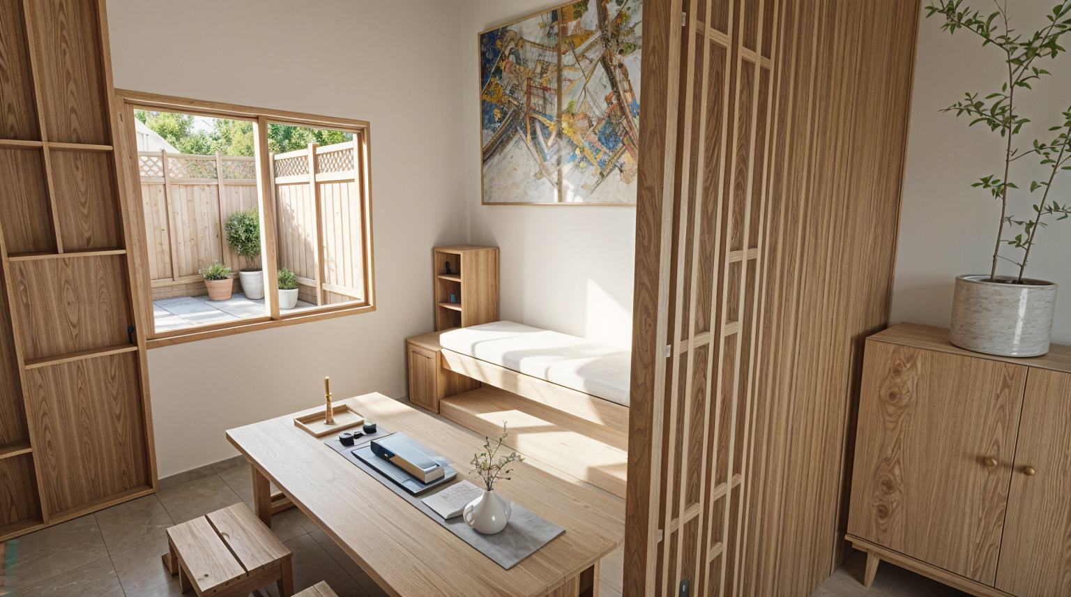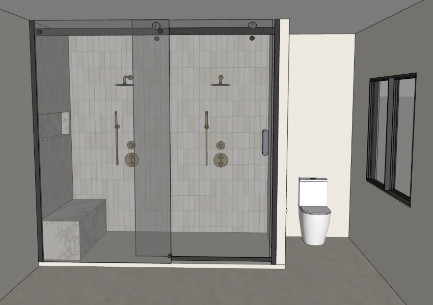 render this bathroom as a photorealistic interior do not change any colors materials finishes proportions or design elements keep the warm medium wood vanity brass faucets and hardware white undermount sinks marble countertop with soft grey veining neutral wall color beige flooring brass framed mirrors and matching sconces exactly as shown maintain the exact layout geometry and camera angle add natural daylight entering from the window based on the angle of the scene creating soft realistic ambient light and gentle shadow falloff do not add harsh beams or window grid shadows only enhance realism by improving material depth reflections lighting behavior subtle shadows and surface texture while keeping all existing colors and materials completely unchanged