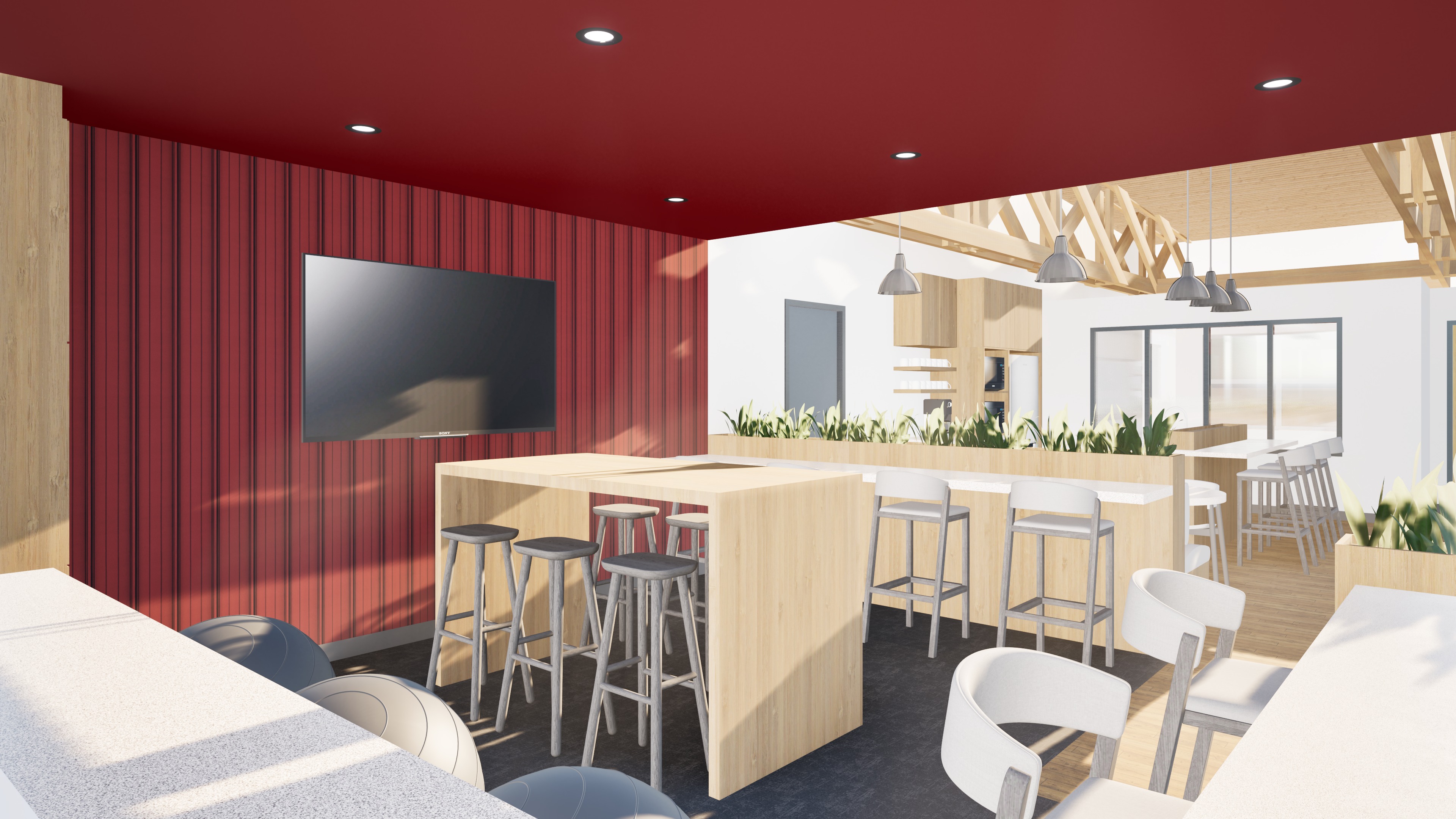 realistic architectural render keep the same tint and color natural light must comme frome the left of the image other windows are interior glasses turn on light fixture and keep global illumination the same as the reference image don t add background in the windows the light fixture must not be transparent replace the plant in the image with more realistic ones keeping the same type of plant